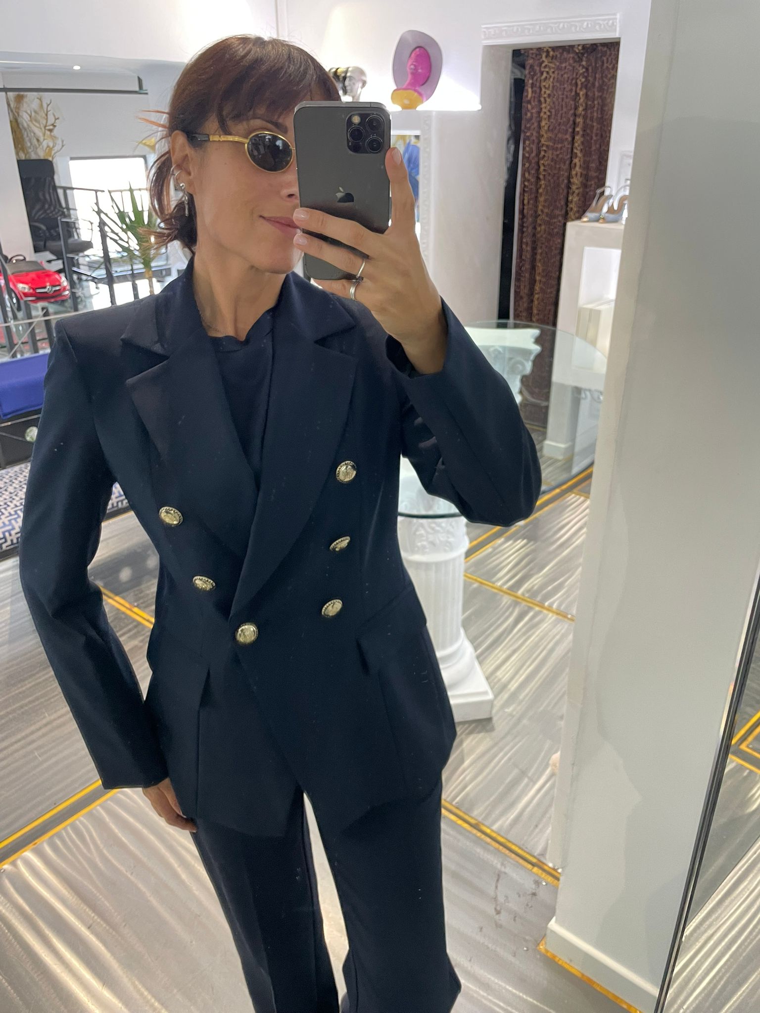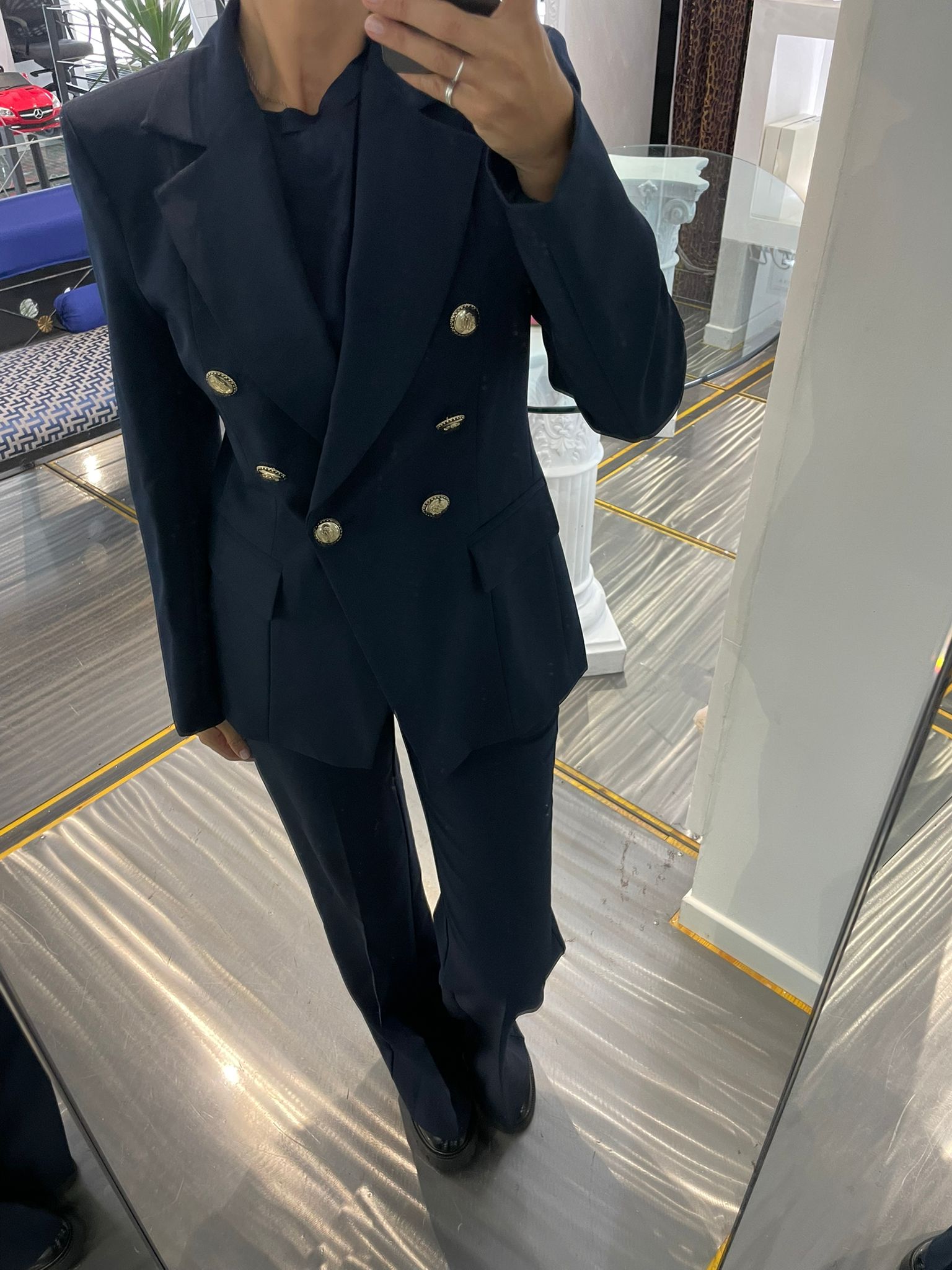 • Zweireihiges Modell mit sechs dekorativen silberfarbenen Metallknöpfen.