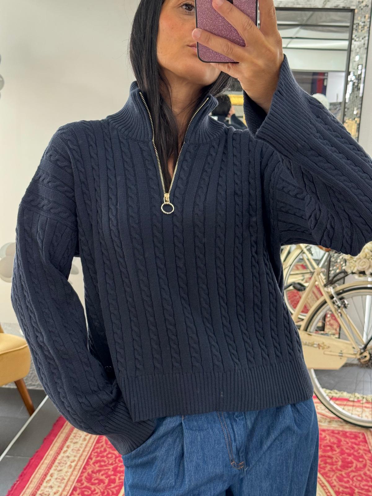 • Kurzer Reißverschluss mit Metallring, hoher Kragen, der offen oder geschlossen bleiben kann.
