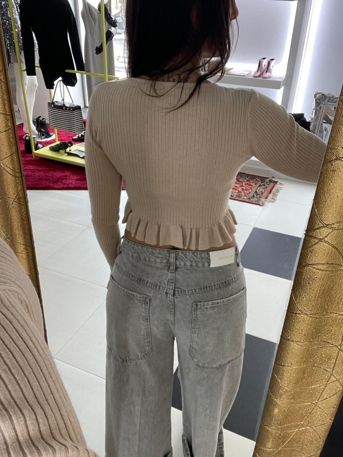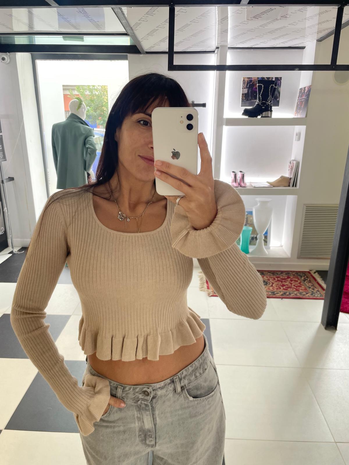 Der kurze Schnitt betont die Silhouette, während die Rüsche am Saum für Bewegung und feminine Eleganz sorgt. Der eckige Ausschnitt und die leicht ausgestellten langen Ärmel runden das detailreiche Design ab – perfekt für jeden Anlass.