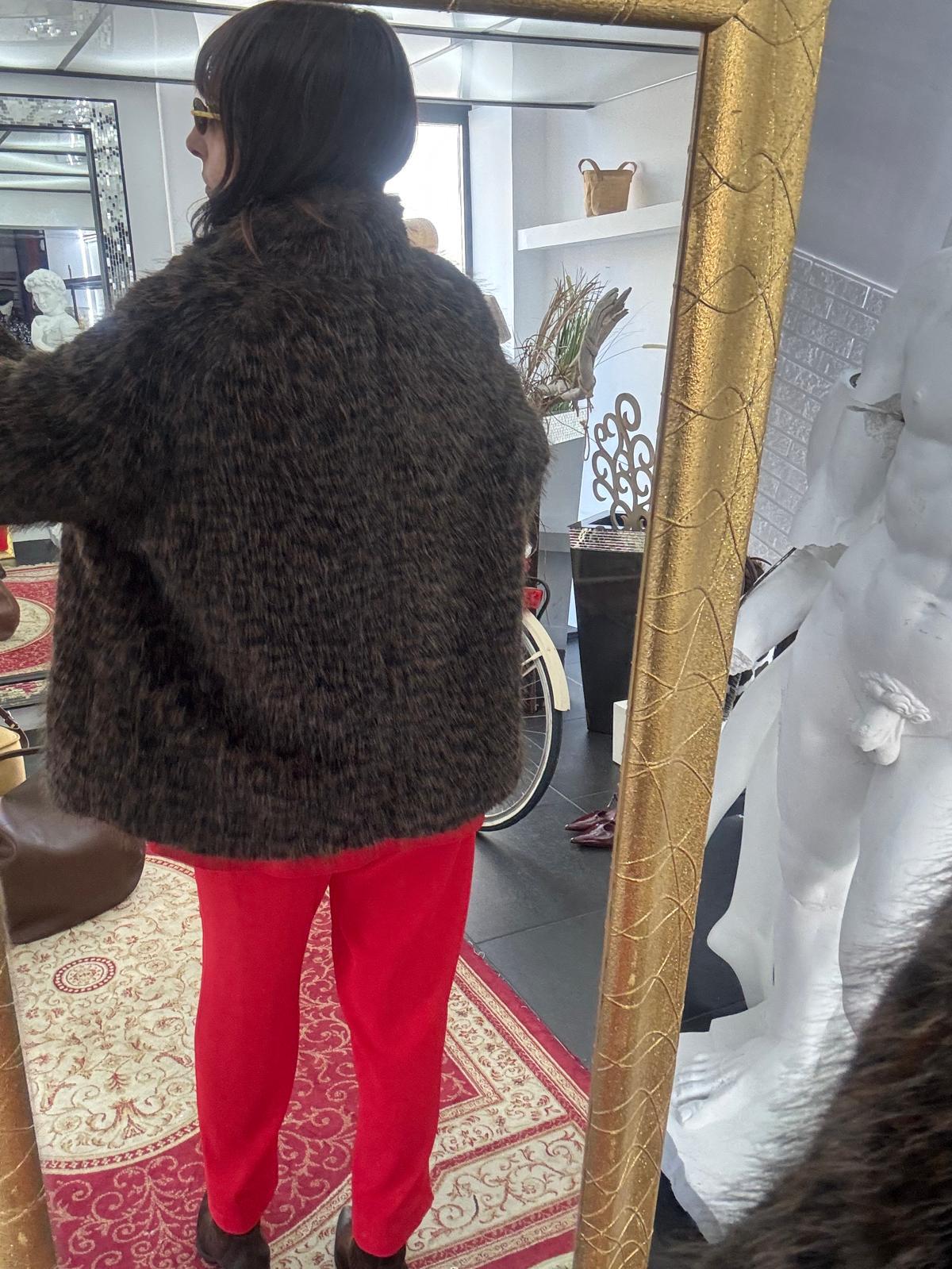 • Modell: Weit geschnittene, kurze Kunstpelzjacke, deren Länge bis knapp unter die Hüfte reicht.