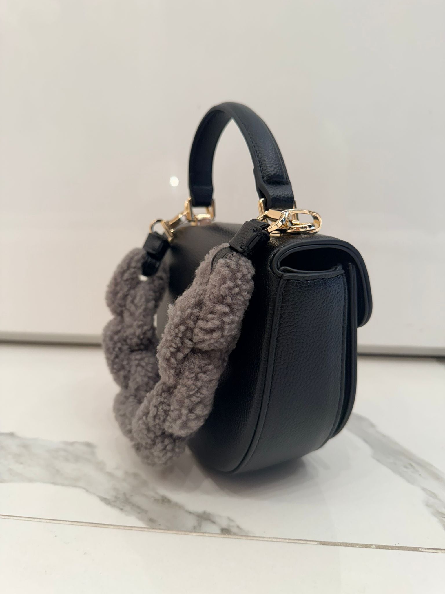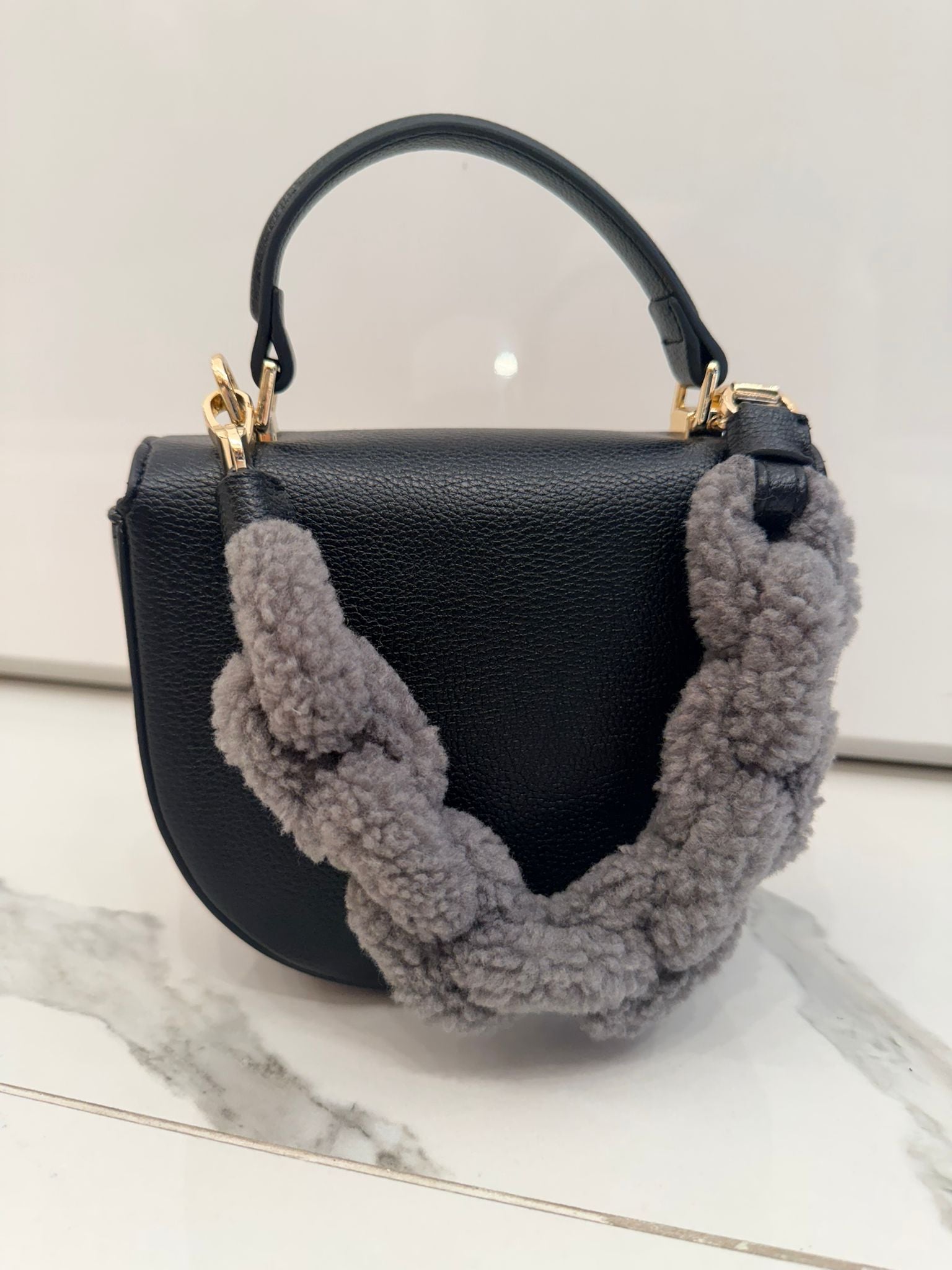 Borsa a mano in ecopelle con manico rivestito in morbido peluche grigio. Dettagli dorati e logo frontale Gaëlle. Originale e trendy, ideale per la stagione autunno/inverno.