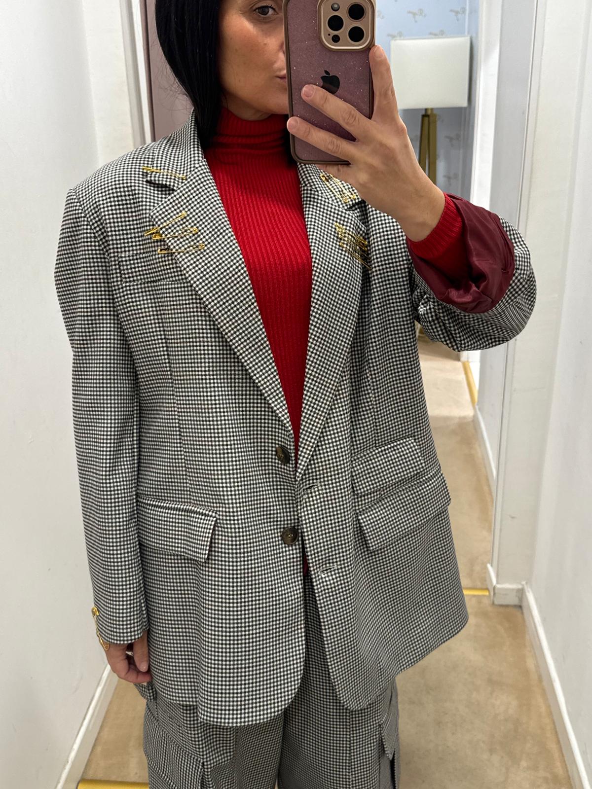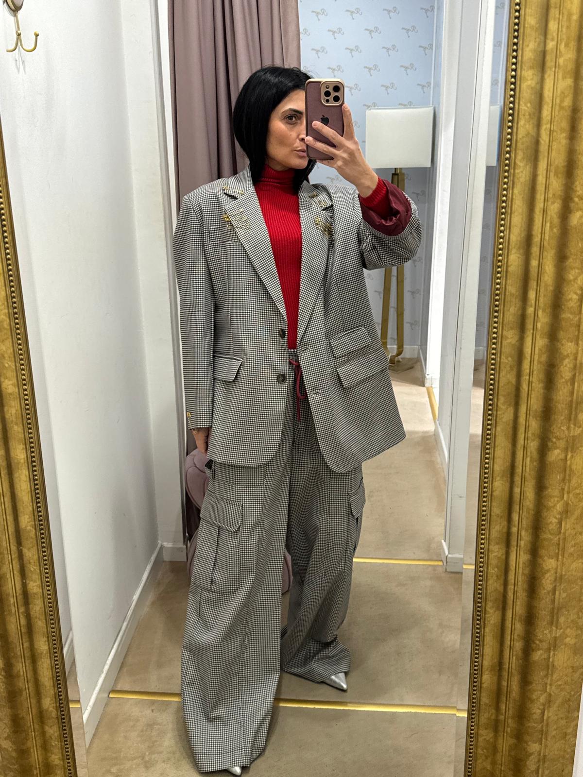 • Fantasia: Classica Pied-de-Poule (bianco e nero/grigio) con sottili righe rosse.
