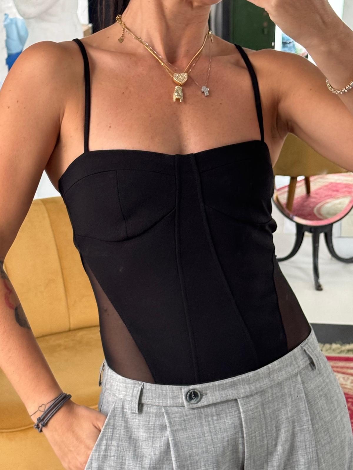 Body nero dal design sensuale e sofisticato, caratterizzato da una struttura aderente che scolpisce la silhouette. Il modello presenta coppe sagomate e spalline sottili, mentre i pannelli laterali in tulle trasparente creano un elegante gioco di trasparenze che esalta la figura con discrezione. Colore: nero