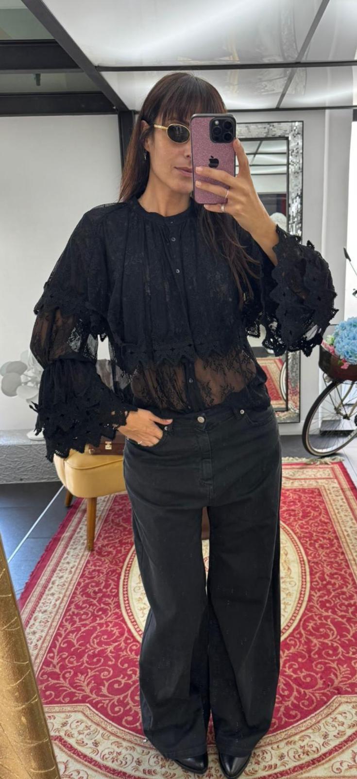 • Details: wide sleeves with ruffles, mandarin collar, front buttons