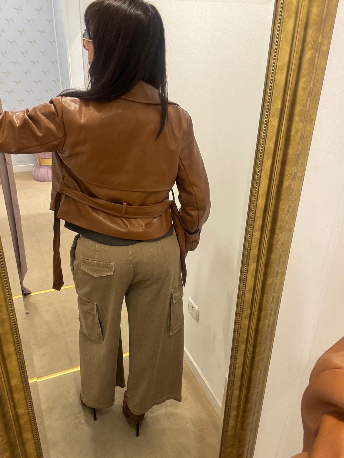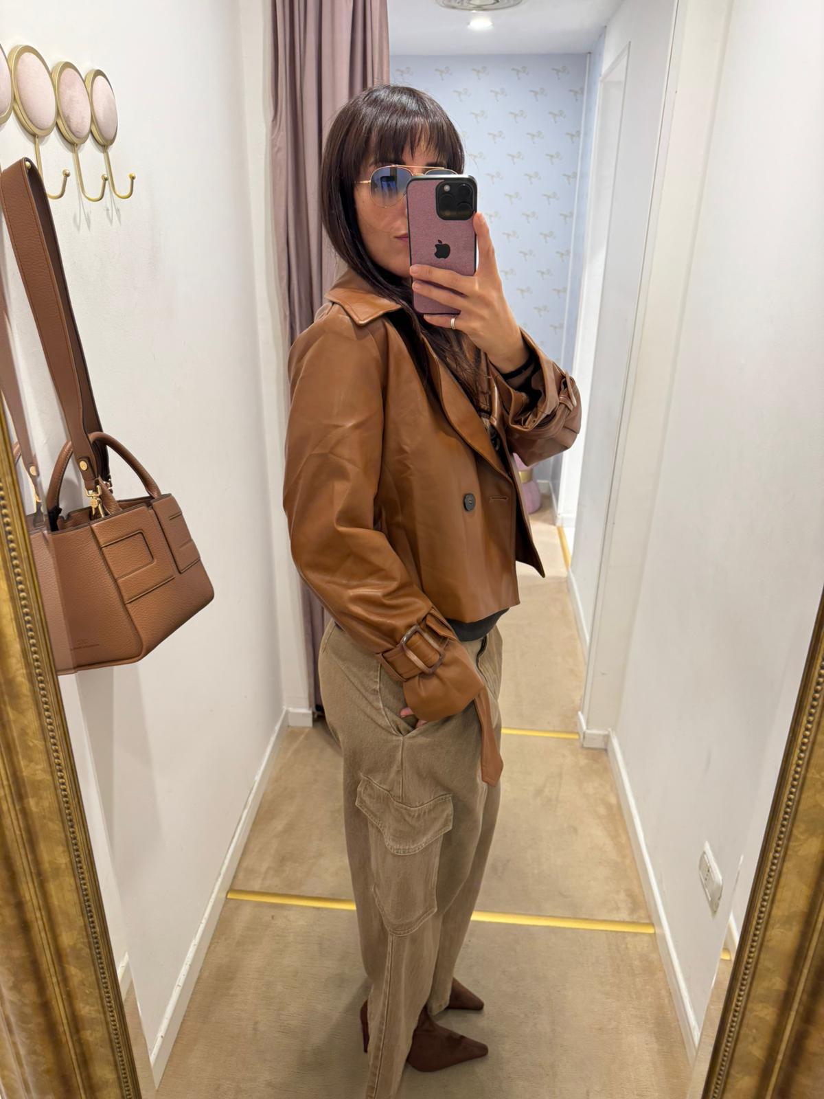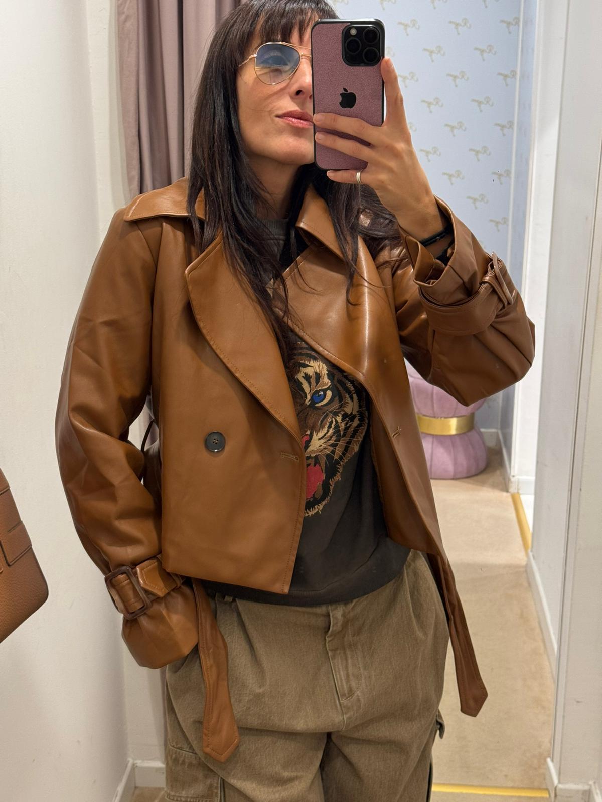 This short caramel-colored faux leather jacket features a double-breasted cut with an adjustable belt at the cuffs and wide lapels, for a bold and feminine look.