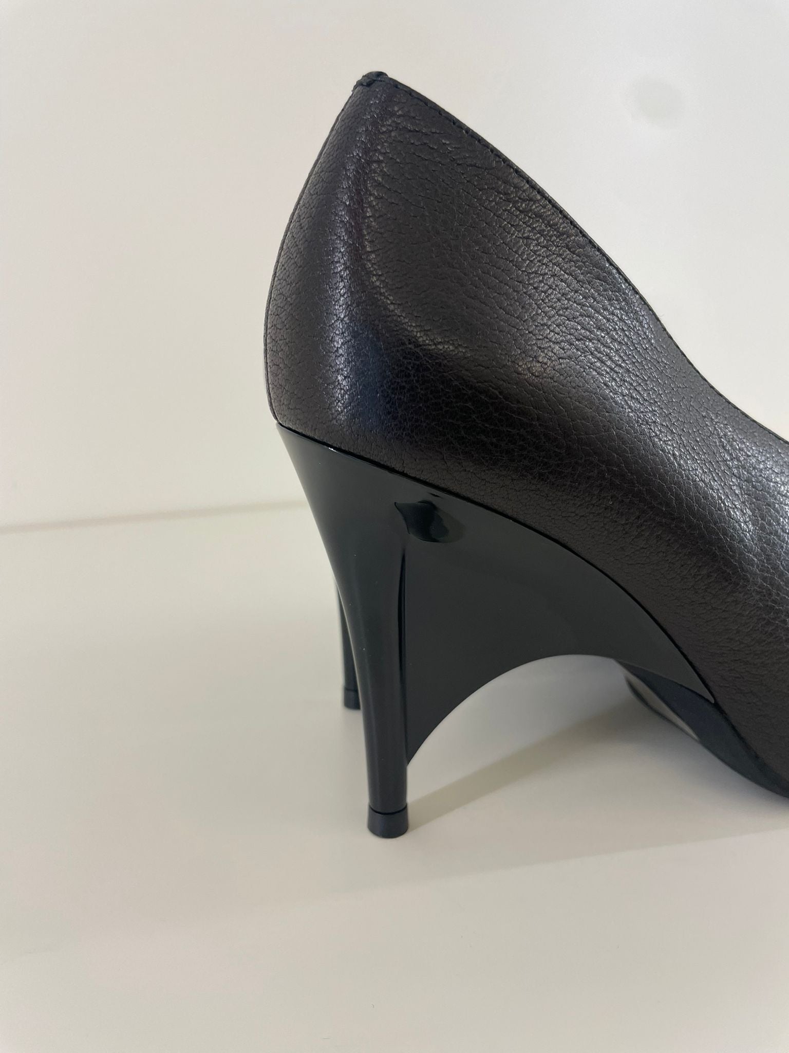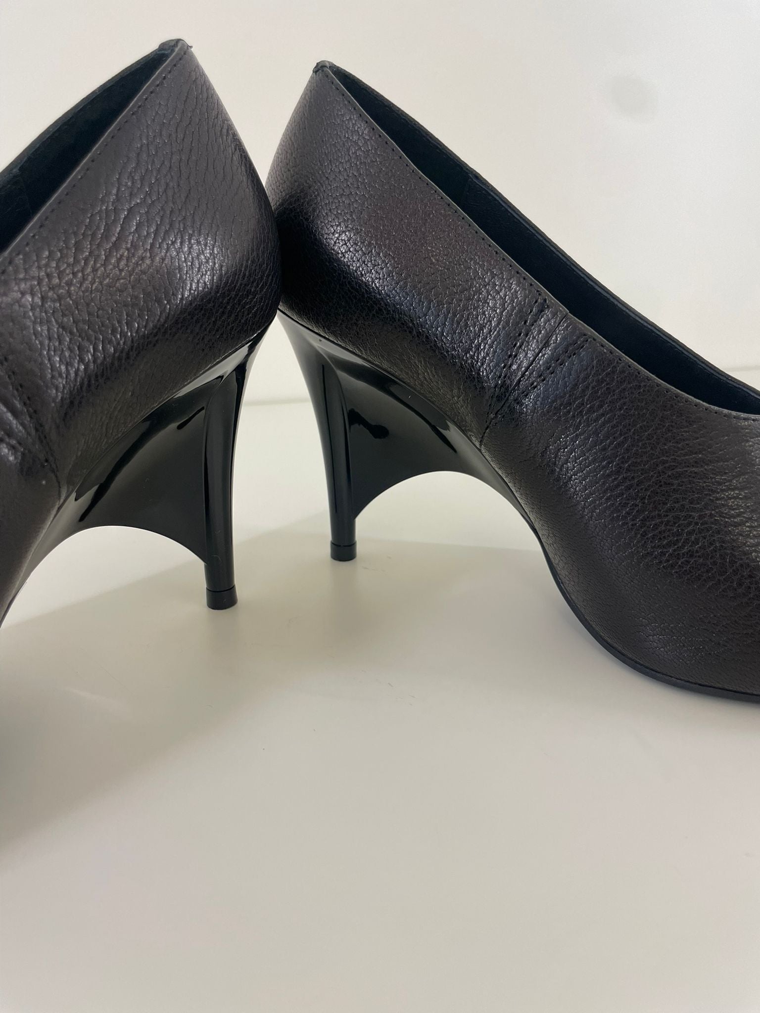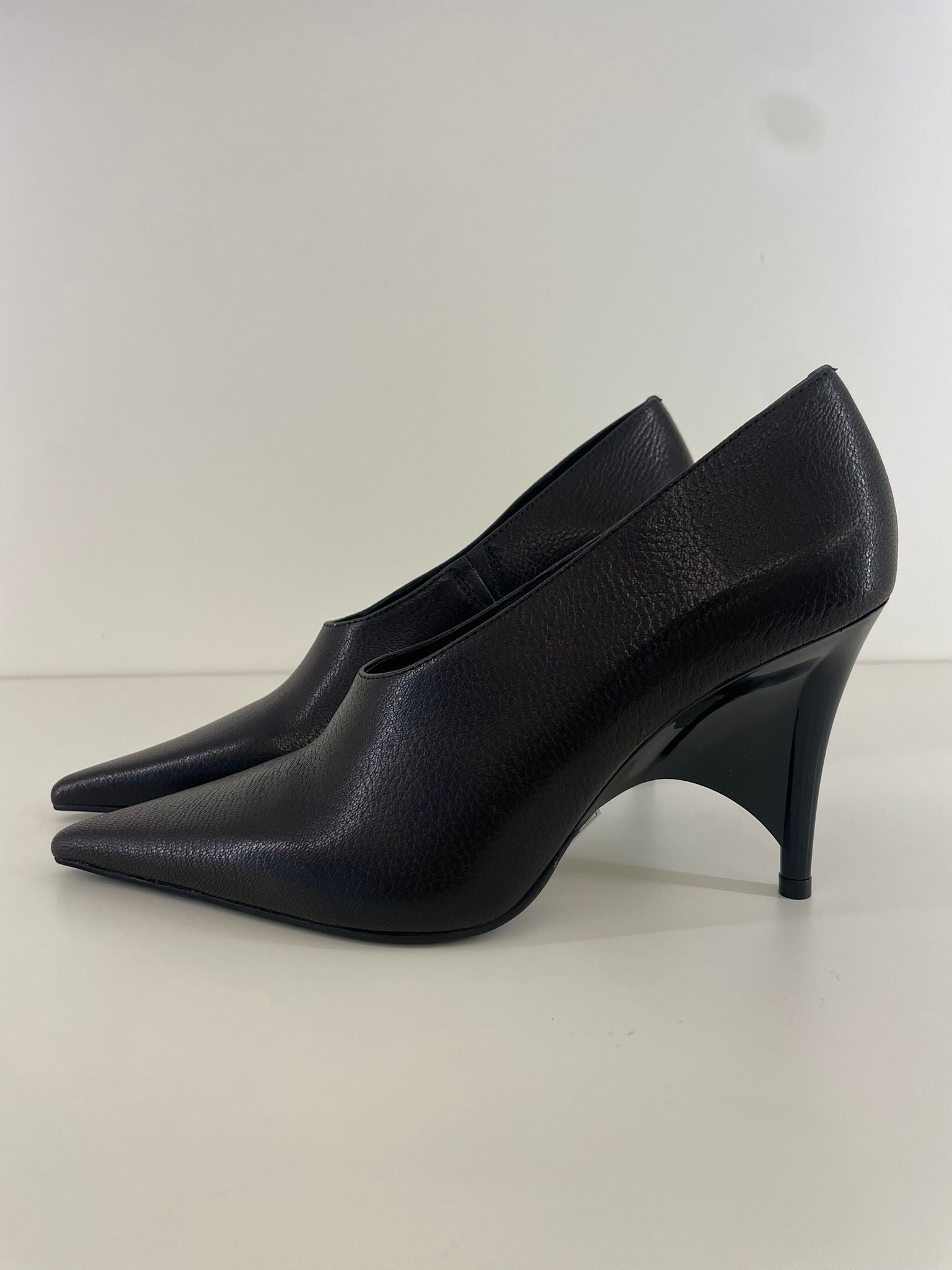 Made of black synthetic leather, they stand out for their tapered toe and clean design that wraps the foot in a slender, feminine line.