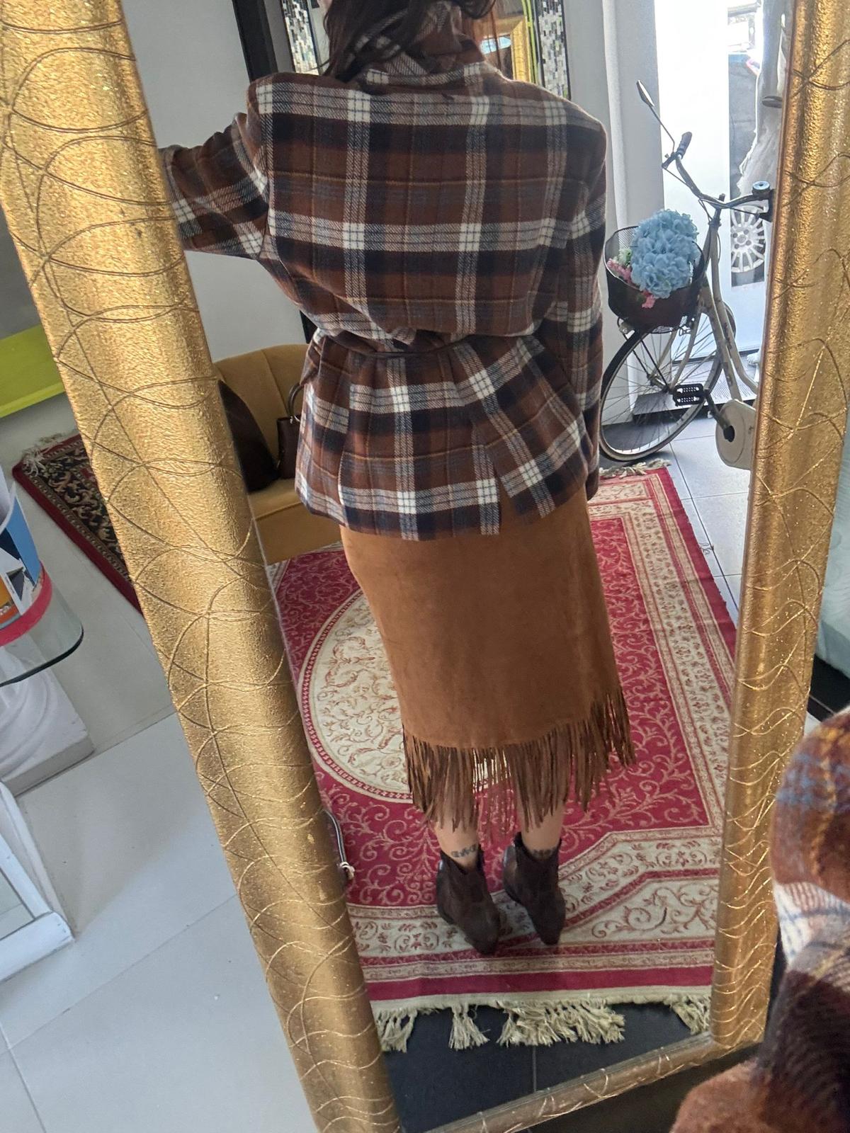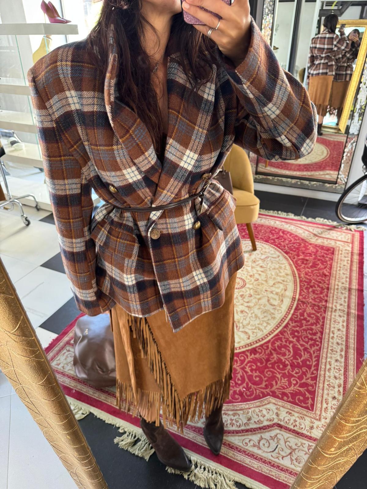• Details: gold buttons on the front and thin leather belt that cinchs the waist, creating a feminine silhouette.