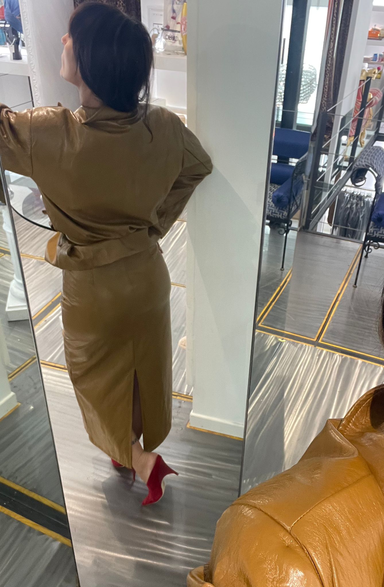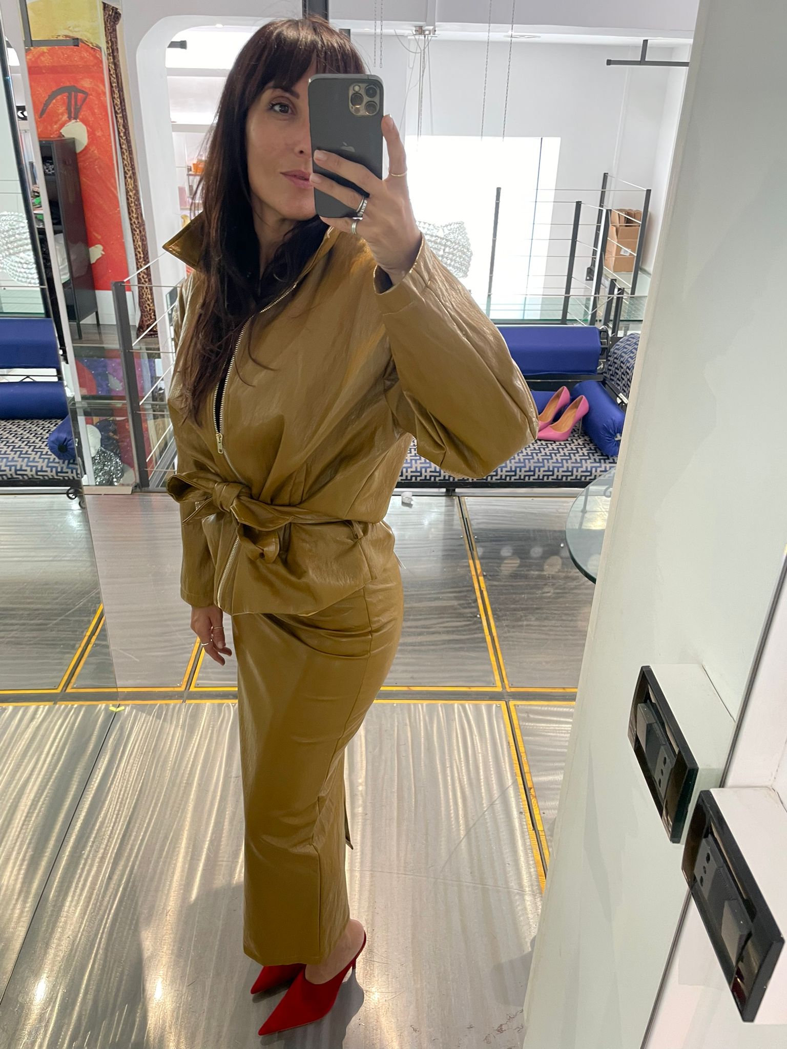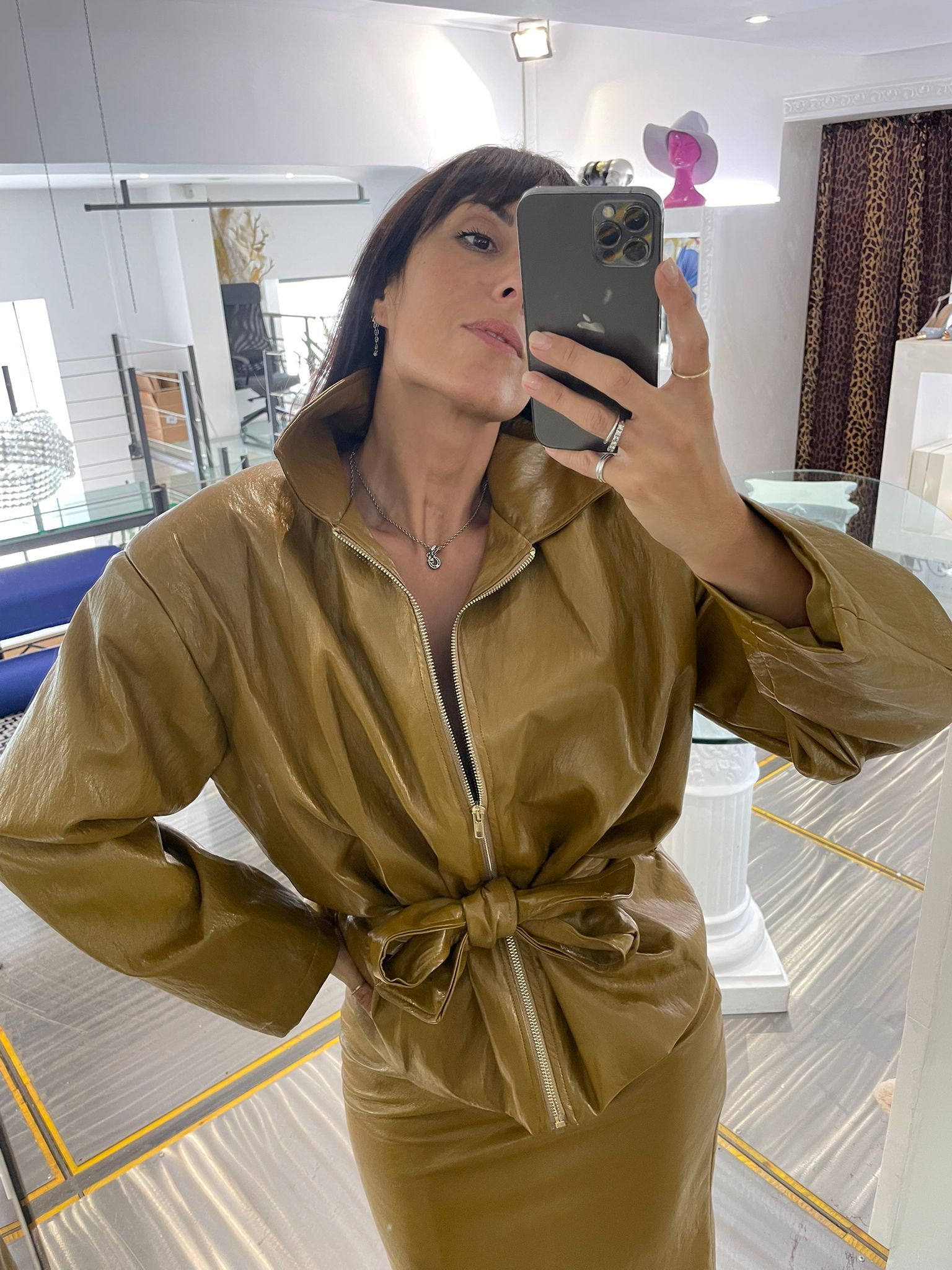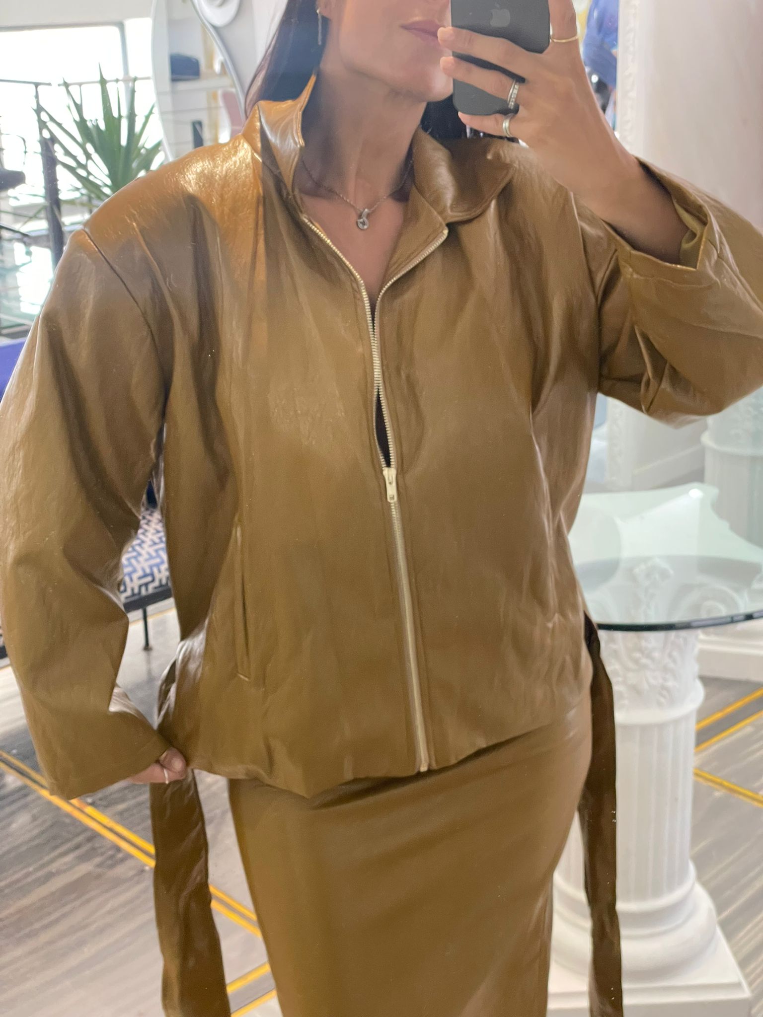 Faux leather jacket with zip fastening and tone-on-tone belt.