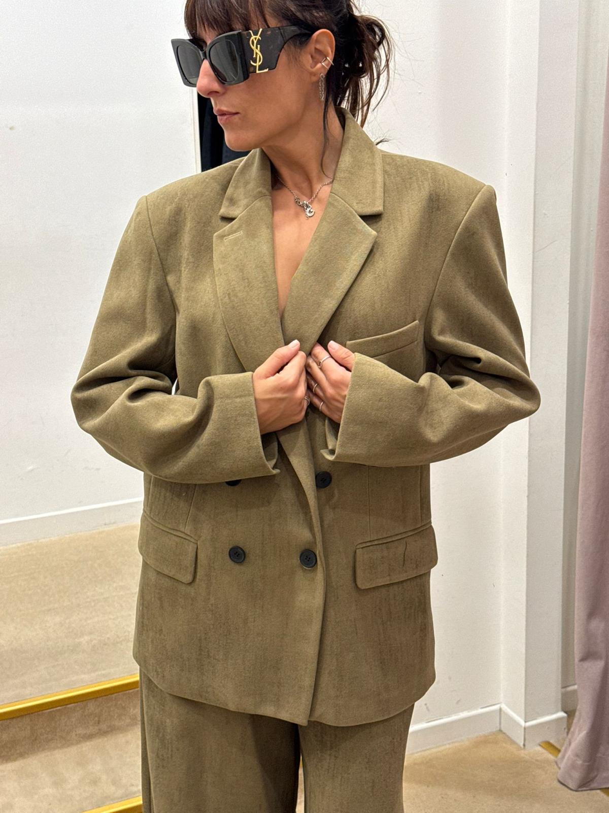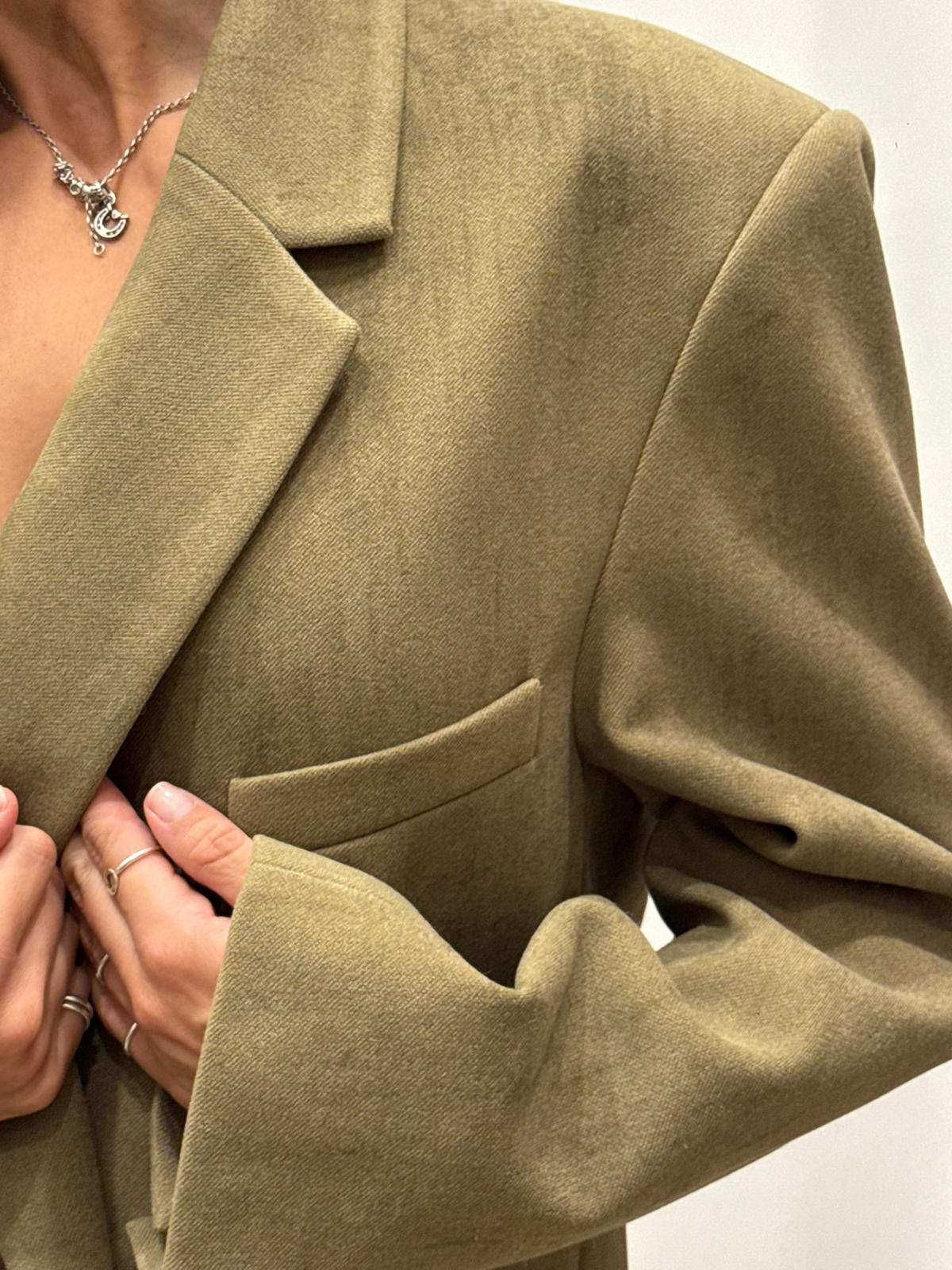 The jacket is an oversized, double-breasted style with a masculine fit. It features classic peak lapels, six dark buttons on the front (four of which are visible in the center), a welt pocket on the chest, and two flap pockets on the sides. The fabric is soft, with a velvety feel, in a light khaki green with a sandy hue. The fit is straight and structured, with slightly accentuated shoulders that give it an elegant and contemporary look.