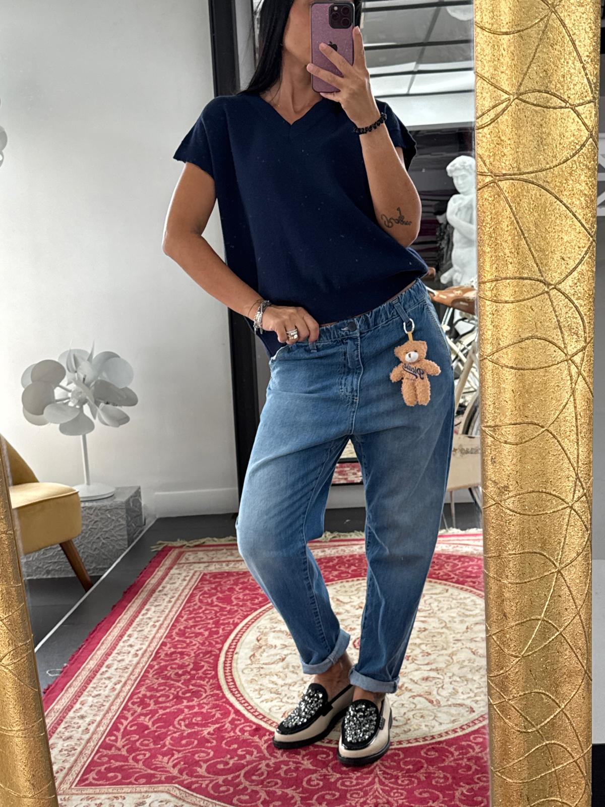 • Jeans model, always medium-waisted, with elasticated back waistband that makes them more relaxed.