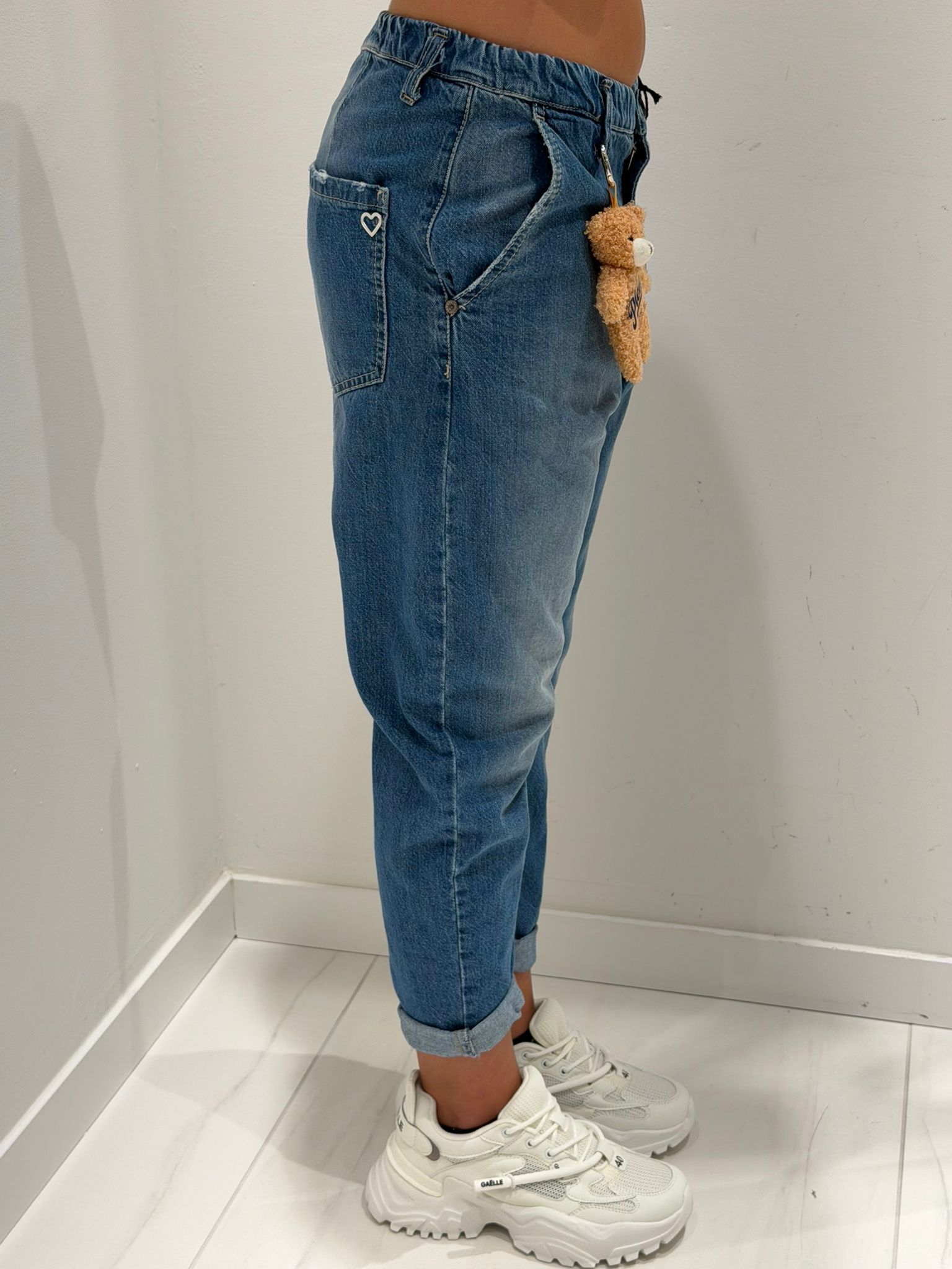 Blue jeans with teddy bear