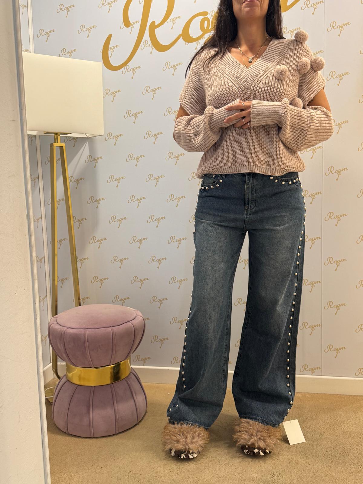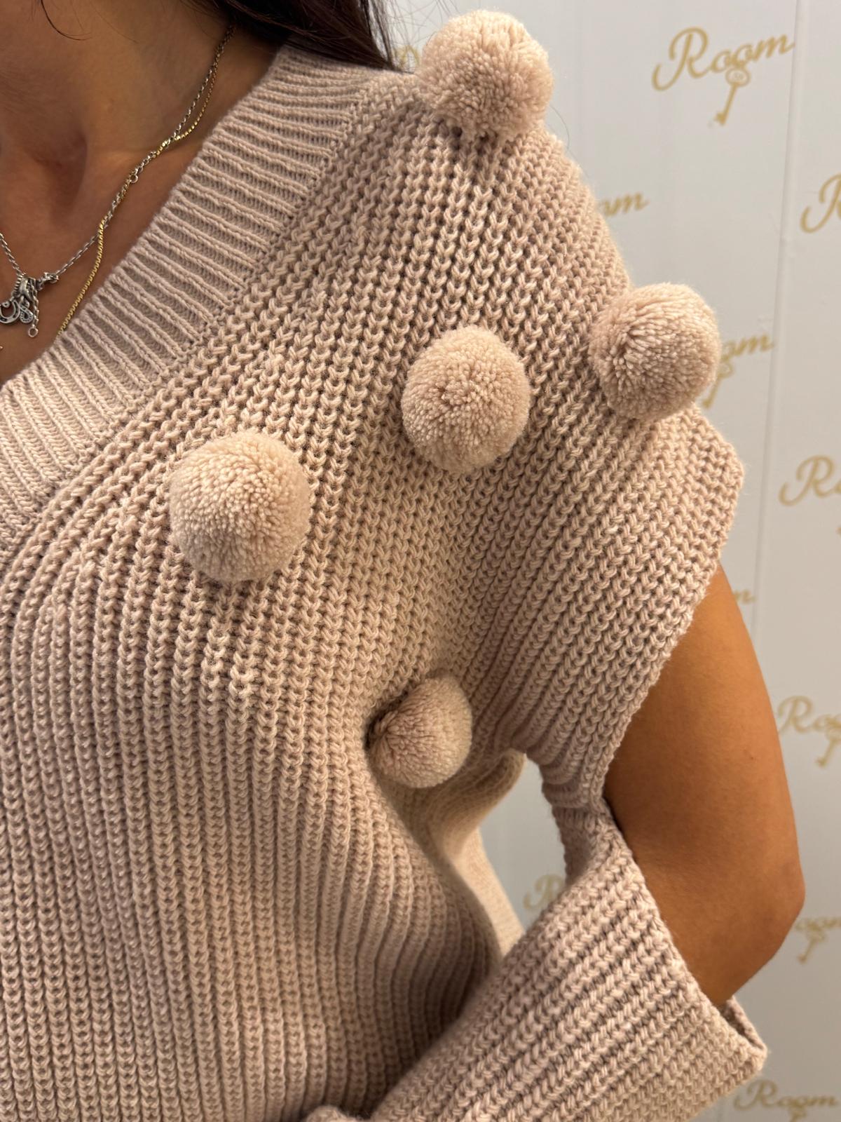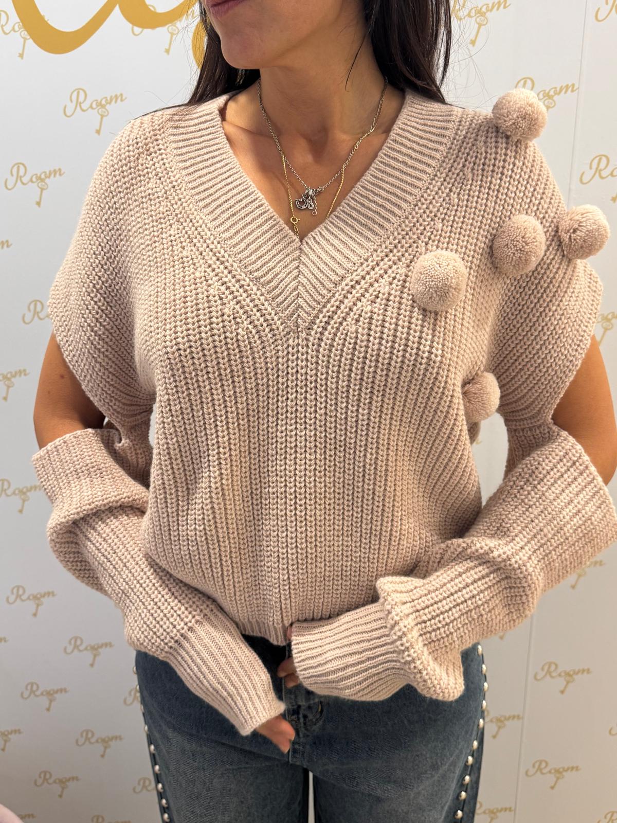 This soft, powder-pink tricot sweater captivates with its original and eye-catching style. The piece features a chunky knit and cute pom poms on the front, adding a playful yet refined touch.