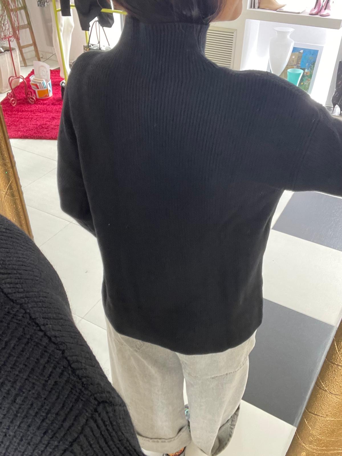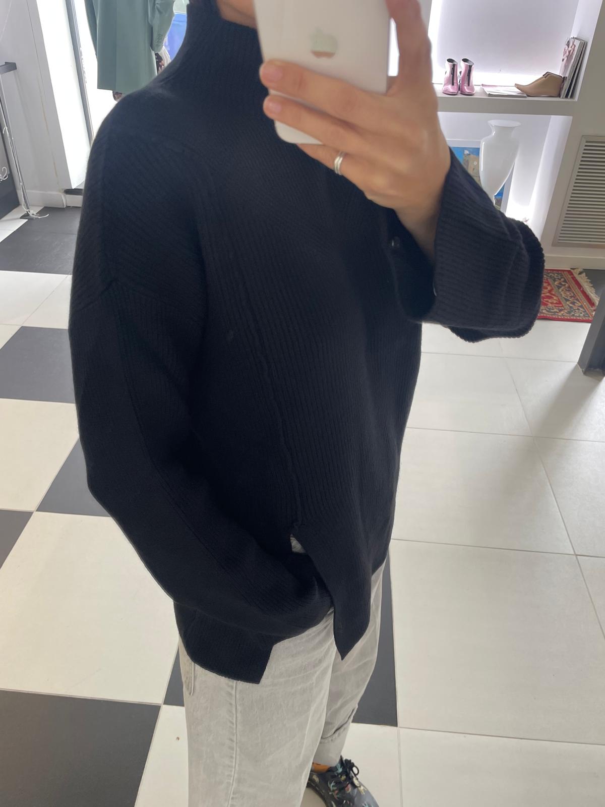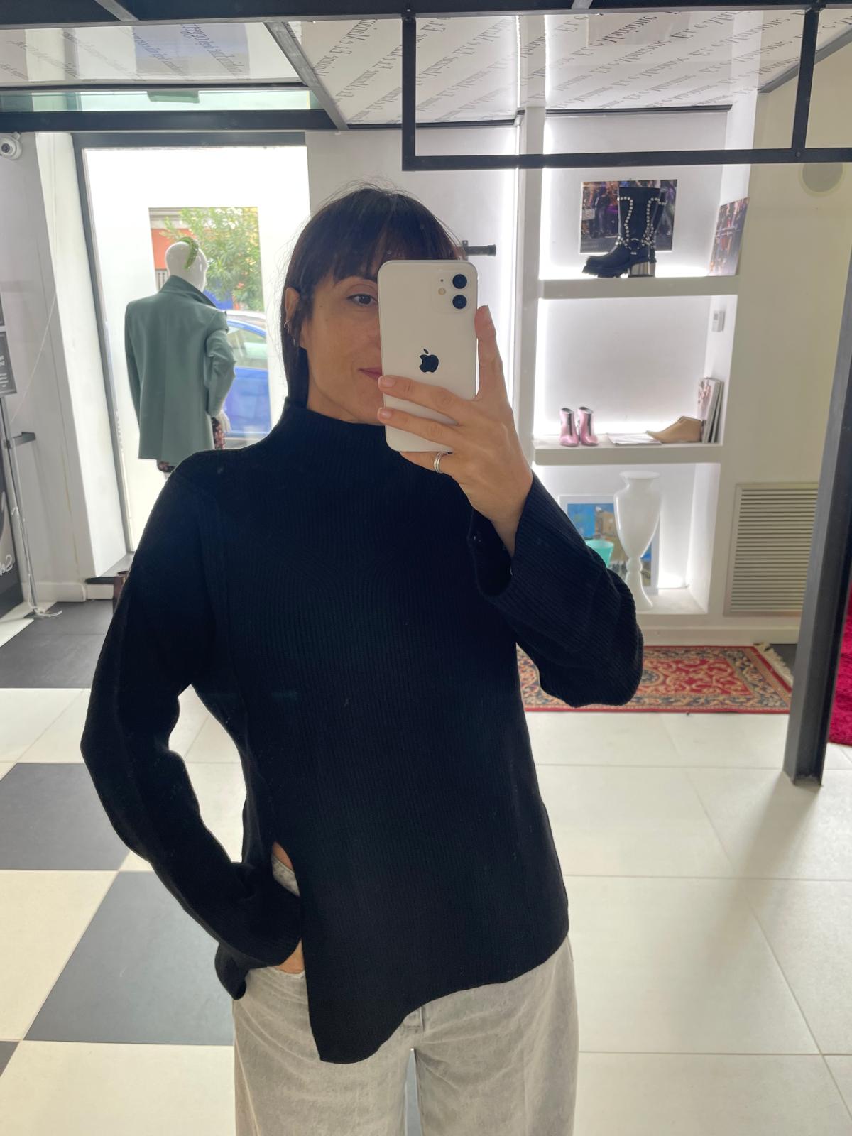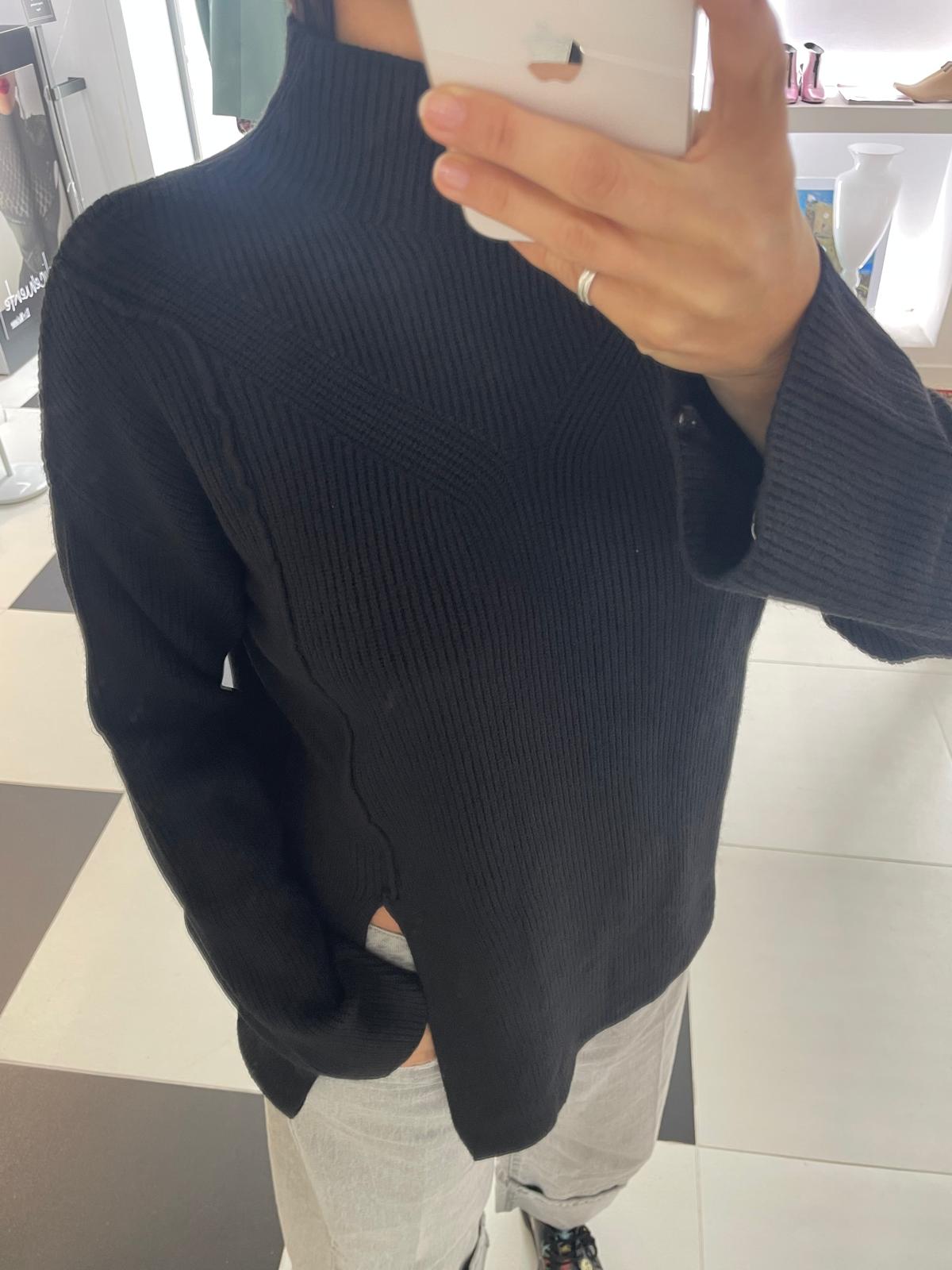 This ribbed knit sweater combines style and practicality thanks to its asymmetrical cut with side slits, which adds movement and slims the figure. The soft high neck adds a touch of sophistication, while the slightly flared long sleeves make the piece modern and refined.