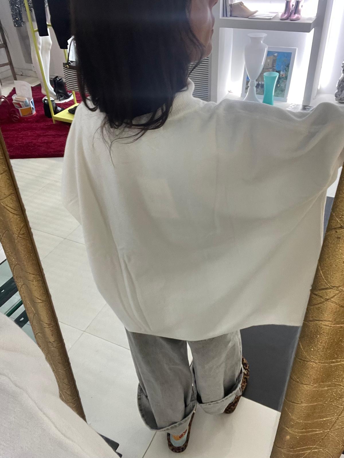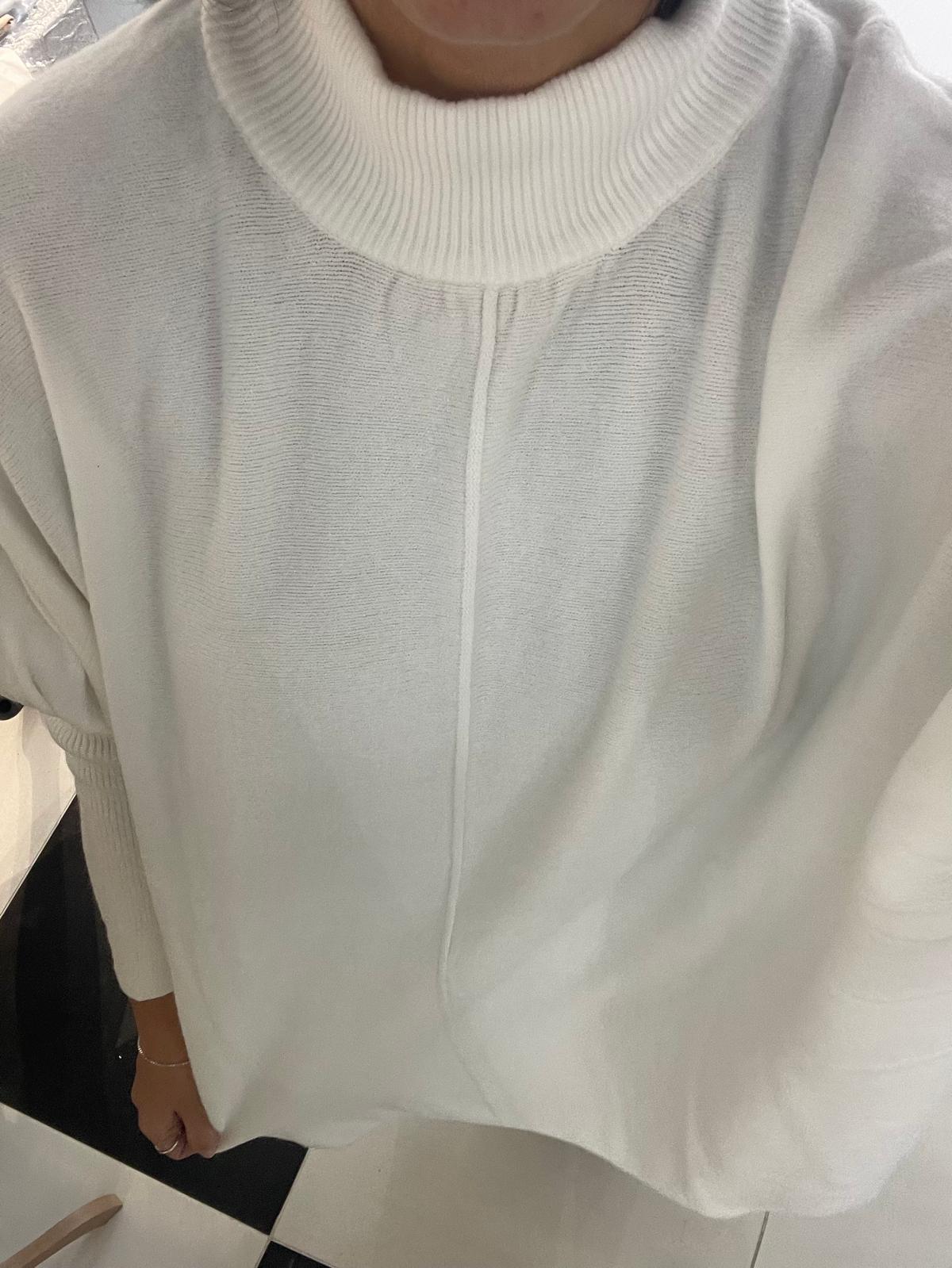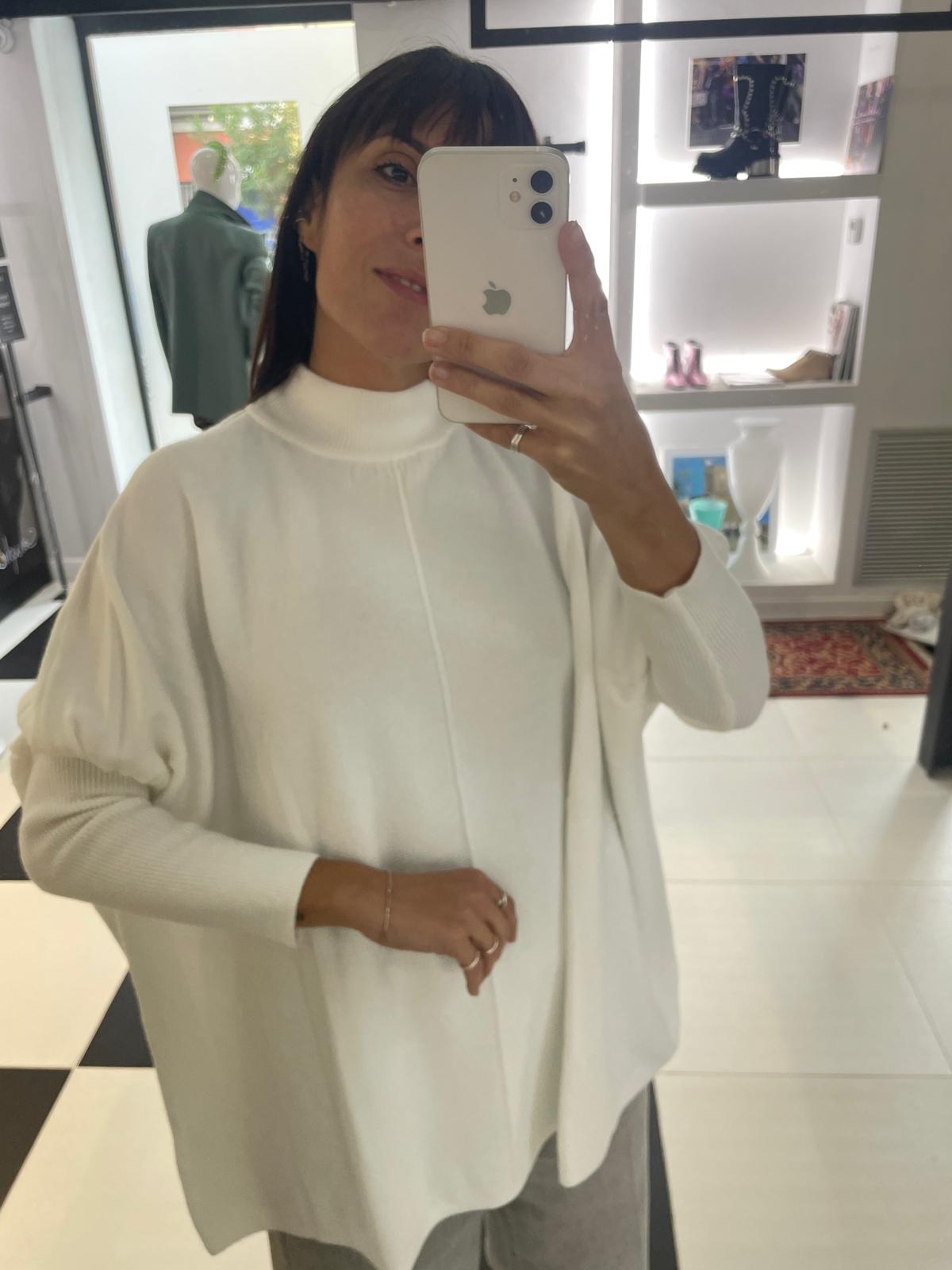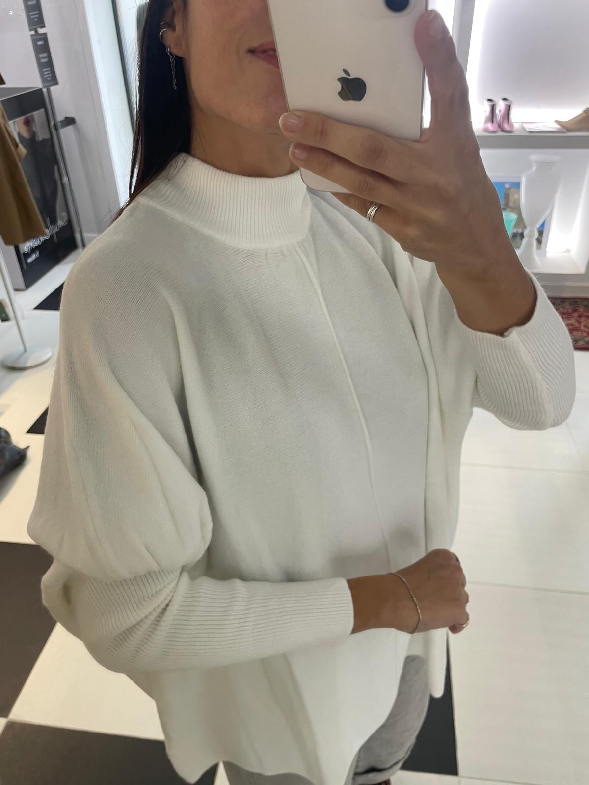 The ribbed high neck and sleeves with differentiated knit add a modern and sophisticated touch, while the soft cut follows the lines of the body without constricting.