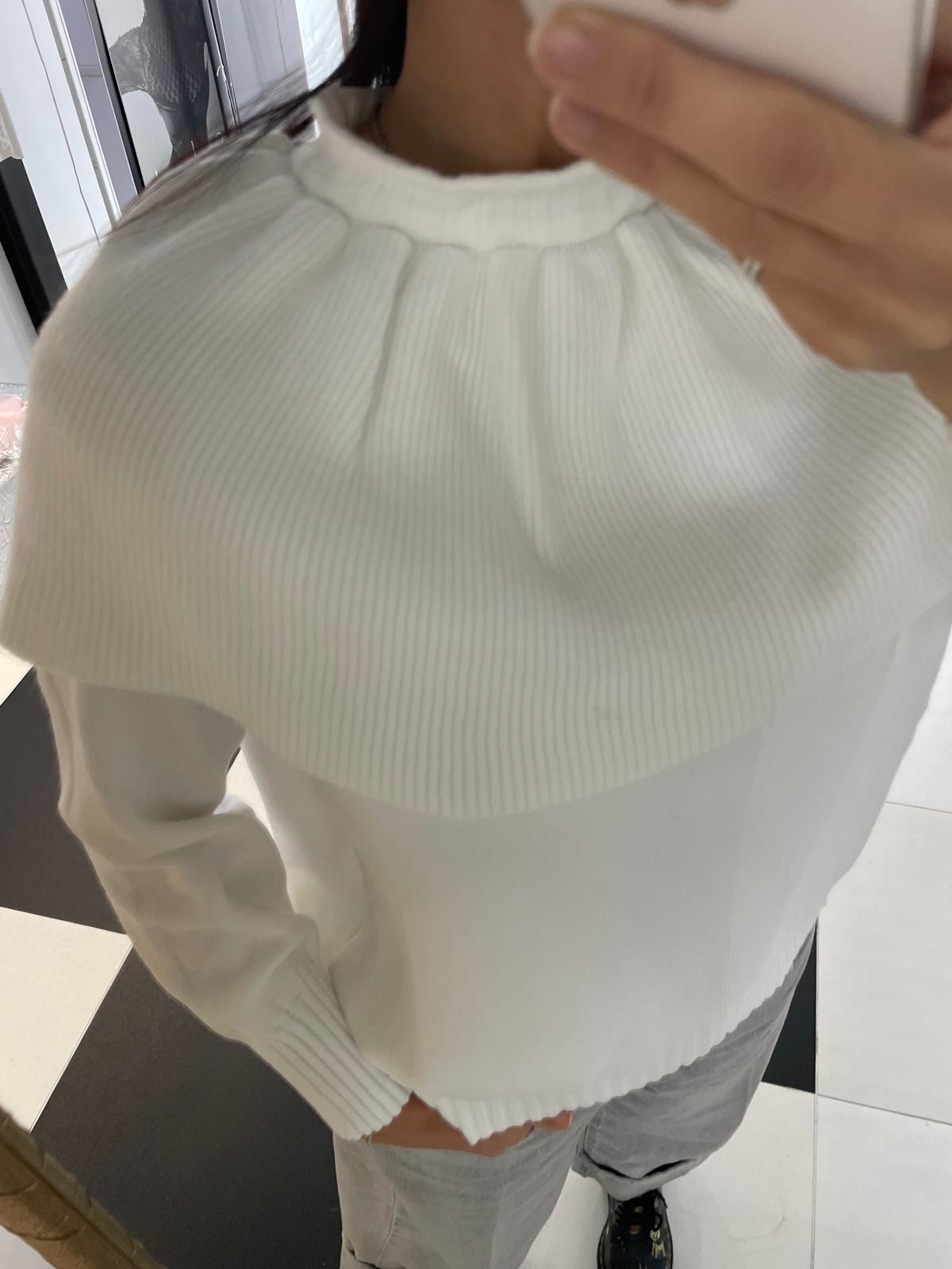 This cream-colored fine-knit sweater features a distinctive ruffle collar, which can be worn open or closed to create two different looks: one more sophisticated and one more casual. The relaxed fit and long sleeves with ribbed cuffs make it comfortable and perfect for the season.