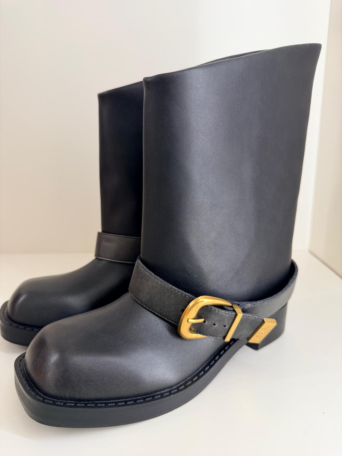 Crafted from a leather-effect material with a matte finish, it features a square line and a clean yet bold design, embellished with a belt with a gold buckle and metal logo details on the back.
