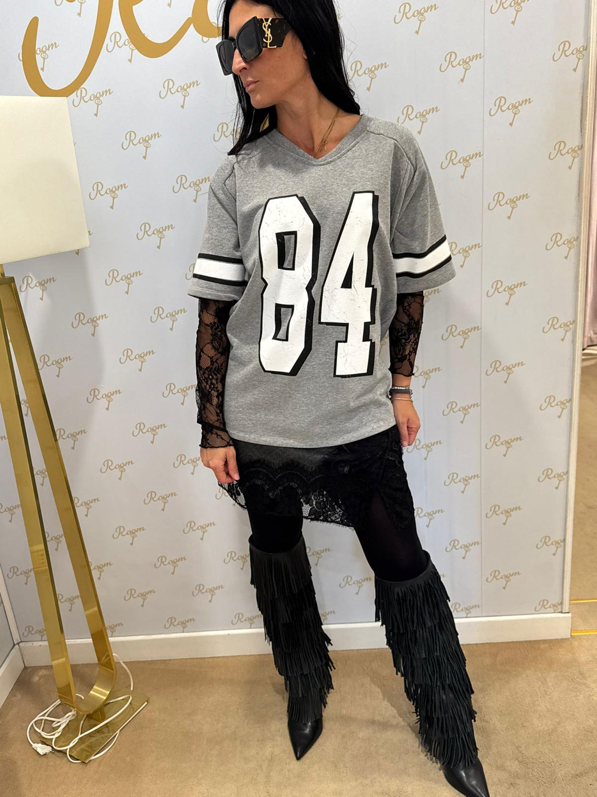 Long T-shirt in melange gray cotton with a contrasting white "84" print on the front. The oversized fit and sporty-inspired design make this piece perfect for a casual yet sophisticated look. The wide sleeves with double black stripes add a contemporary, college vibe.