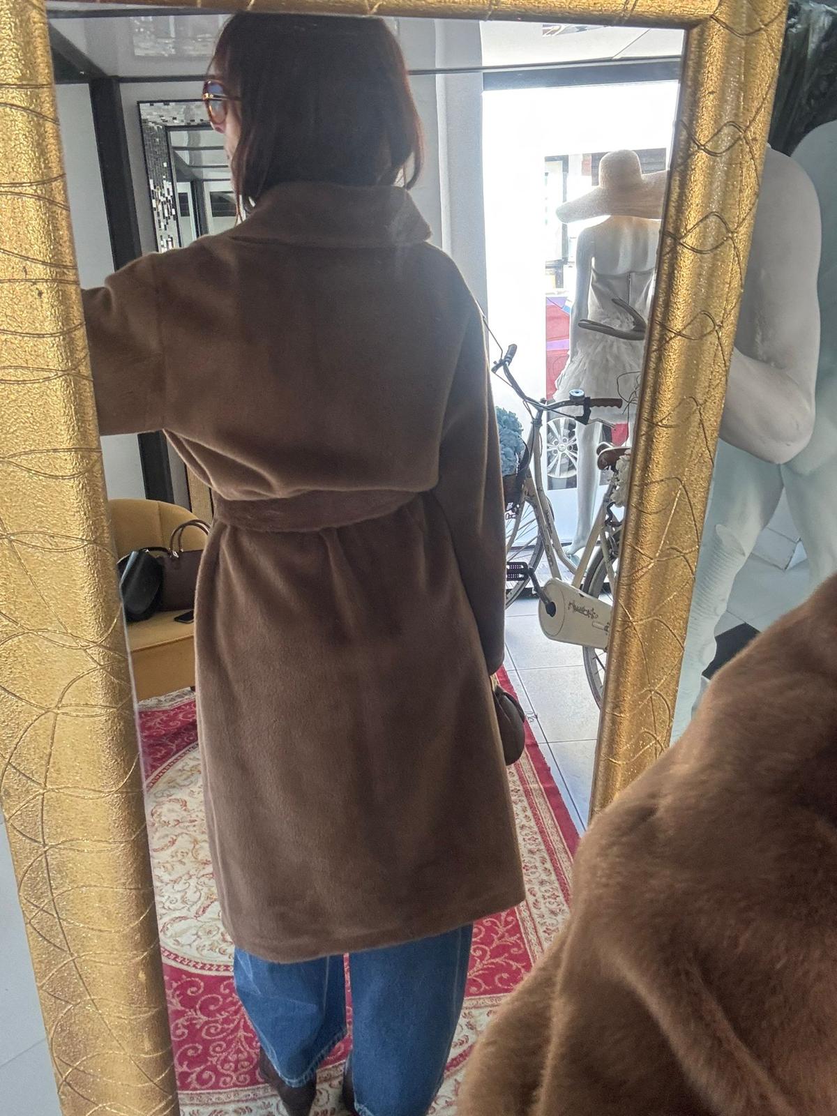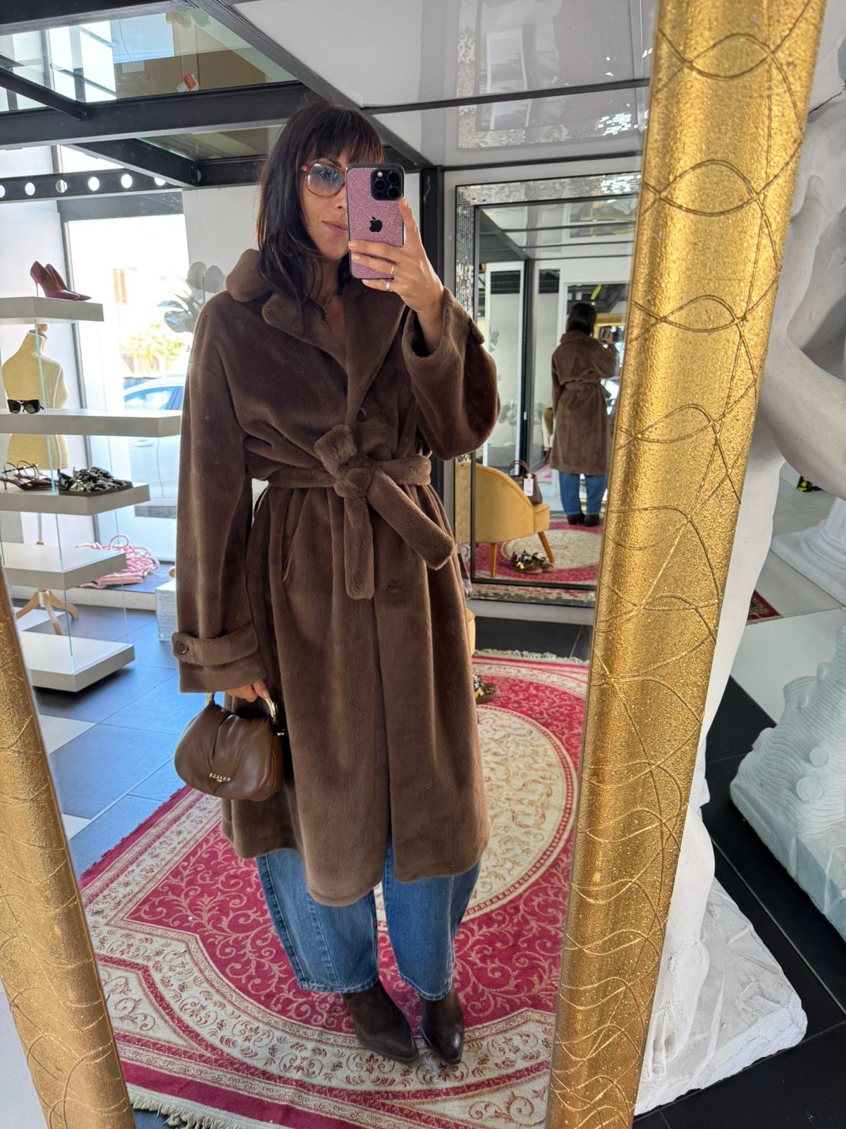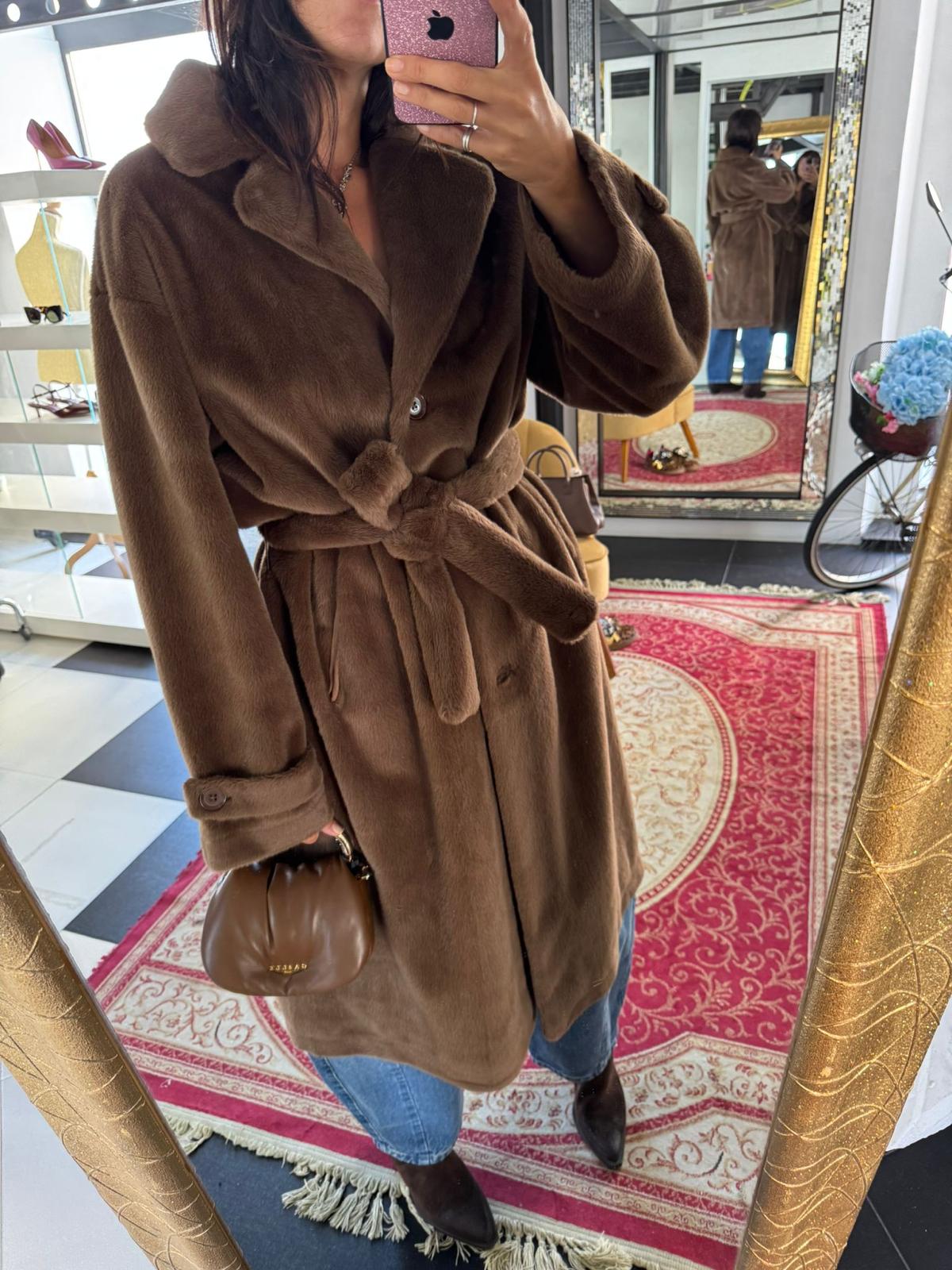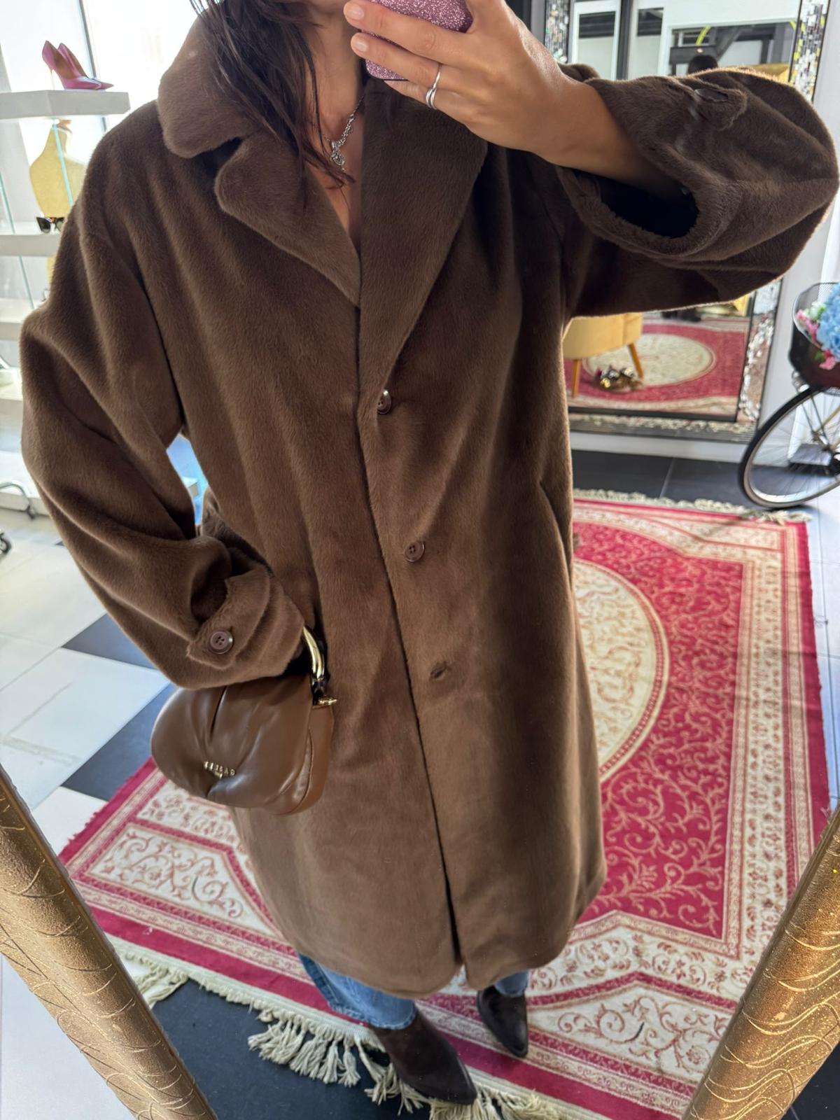 Long coat in soft, fur-like fabric, in chocolate brown. It features a self-fabric belt that accentuates the figure and sleeves with a band and button detail. Elegant and warm, it's perfect for sophisticated winter looks.
