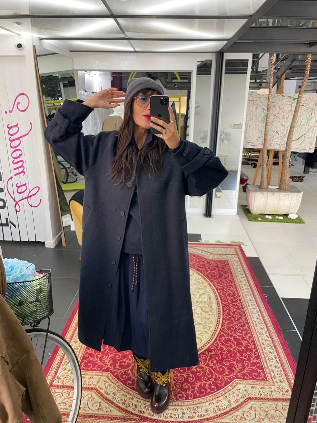 The long coat is made of dark blue wool, with a clean, straight fit. It features a front closure with tone-on-tone buttons, a classic collar without wide lapels, slightly dropped shoulders, and long sleeves with belts and buttoned cuffs. The style is minimal and elegant, with a simple yet versatile cut, suitable for both casual and more formal looks.