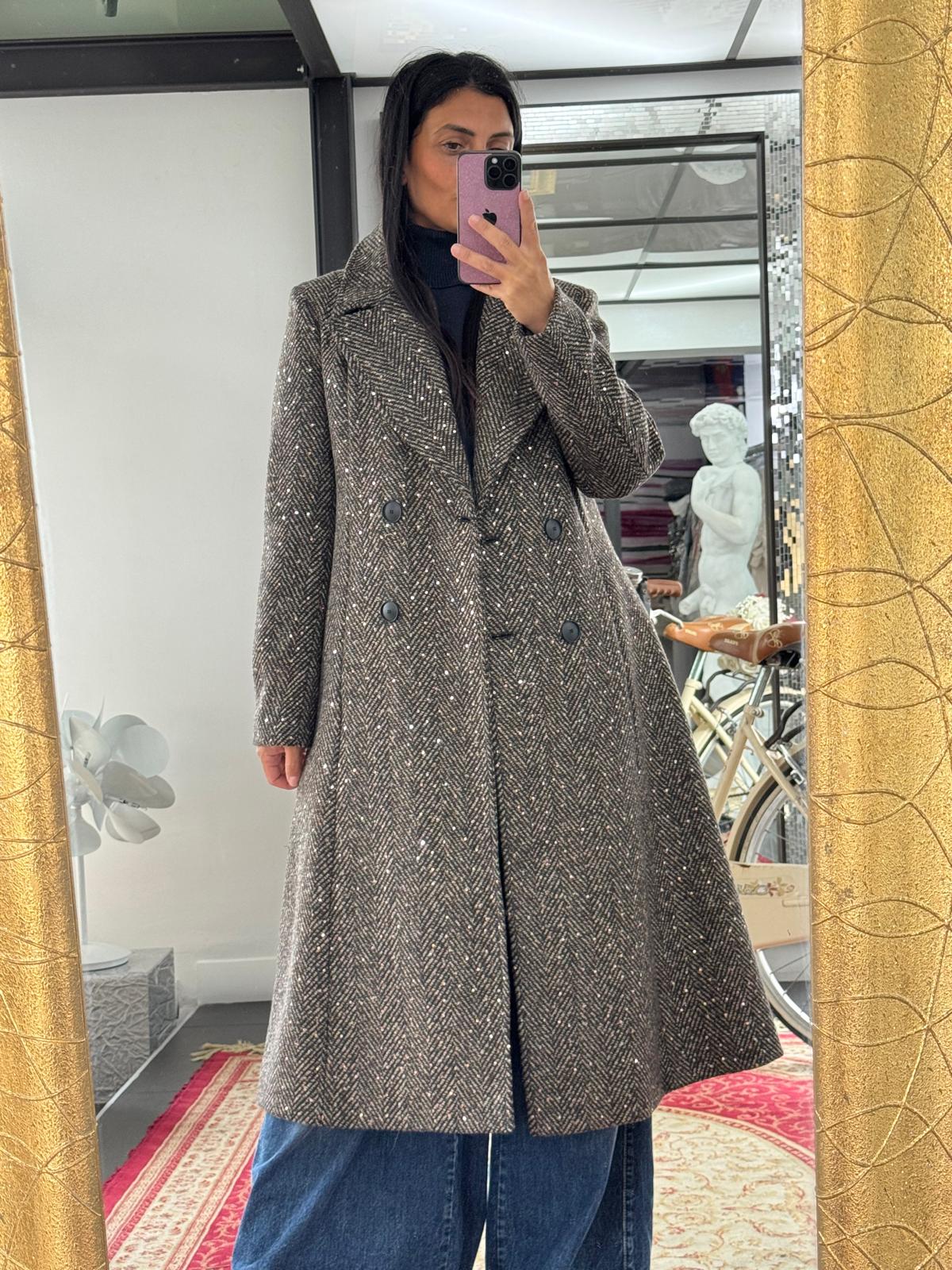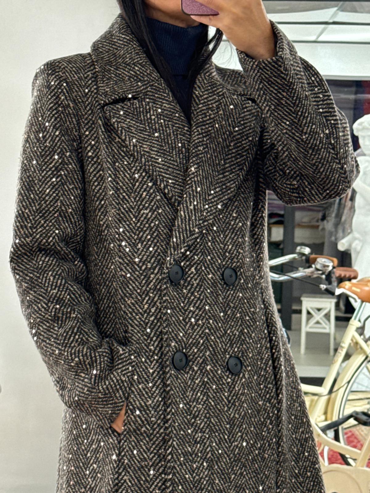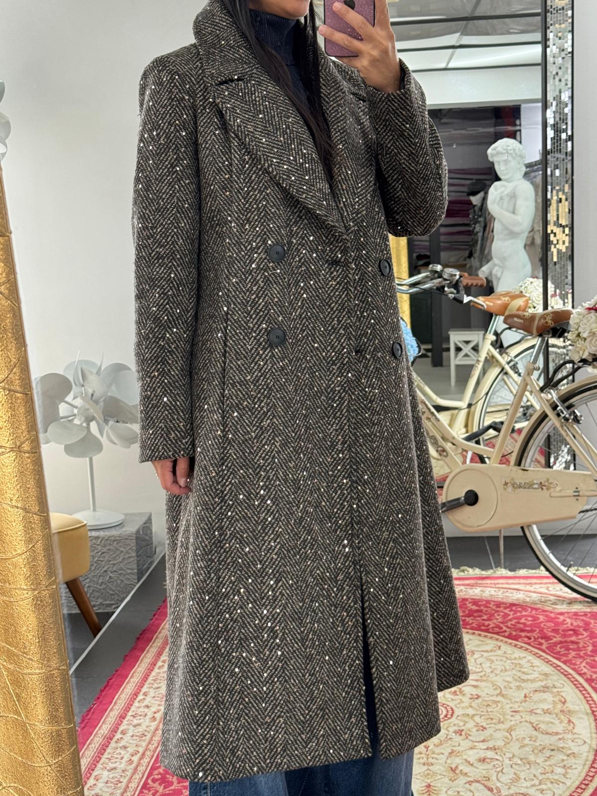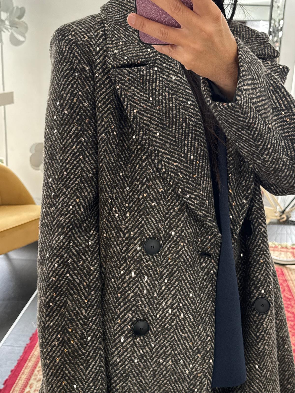 • Line: elegant and tailored, with classic lapels and dark buttons.