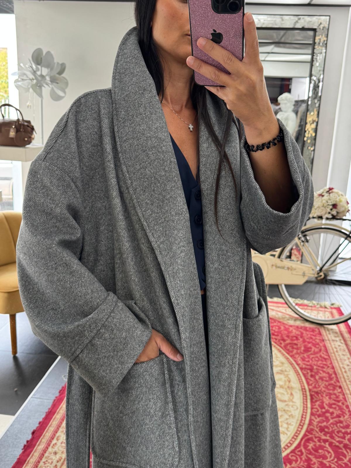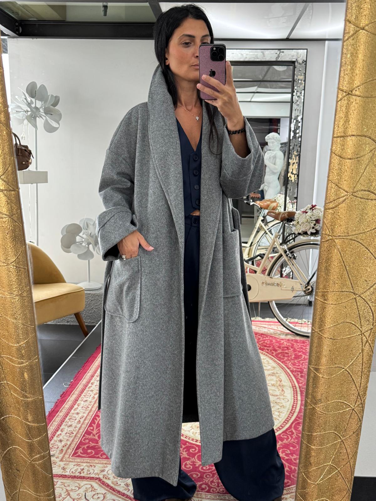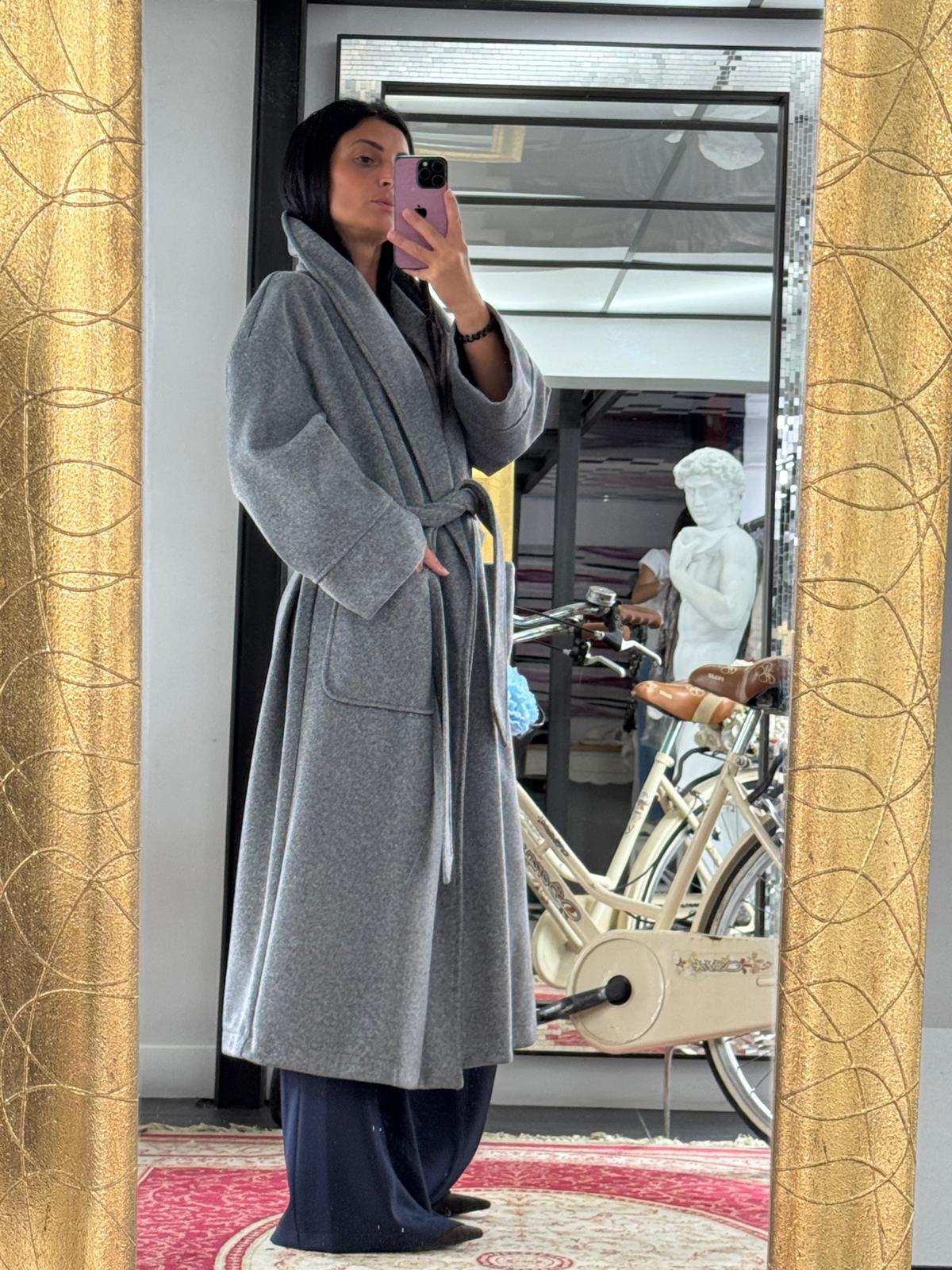 • Long, enveloping, with shawl collar and tie belt at the waist.