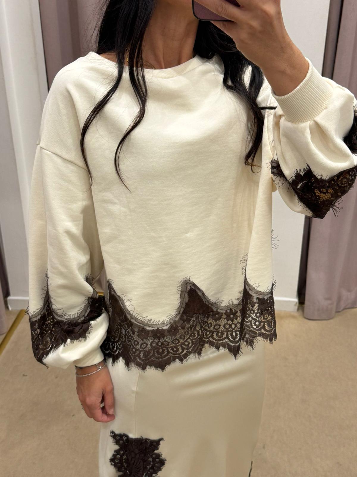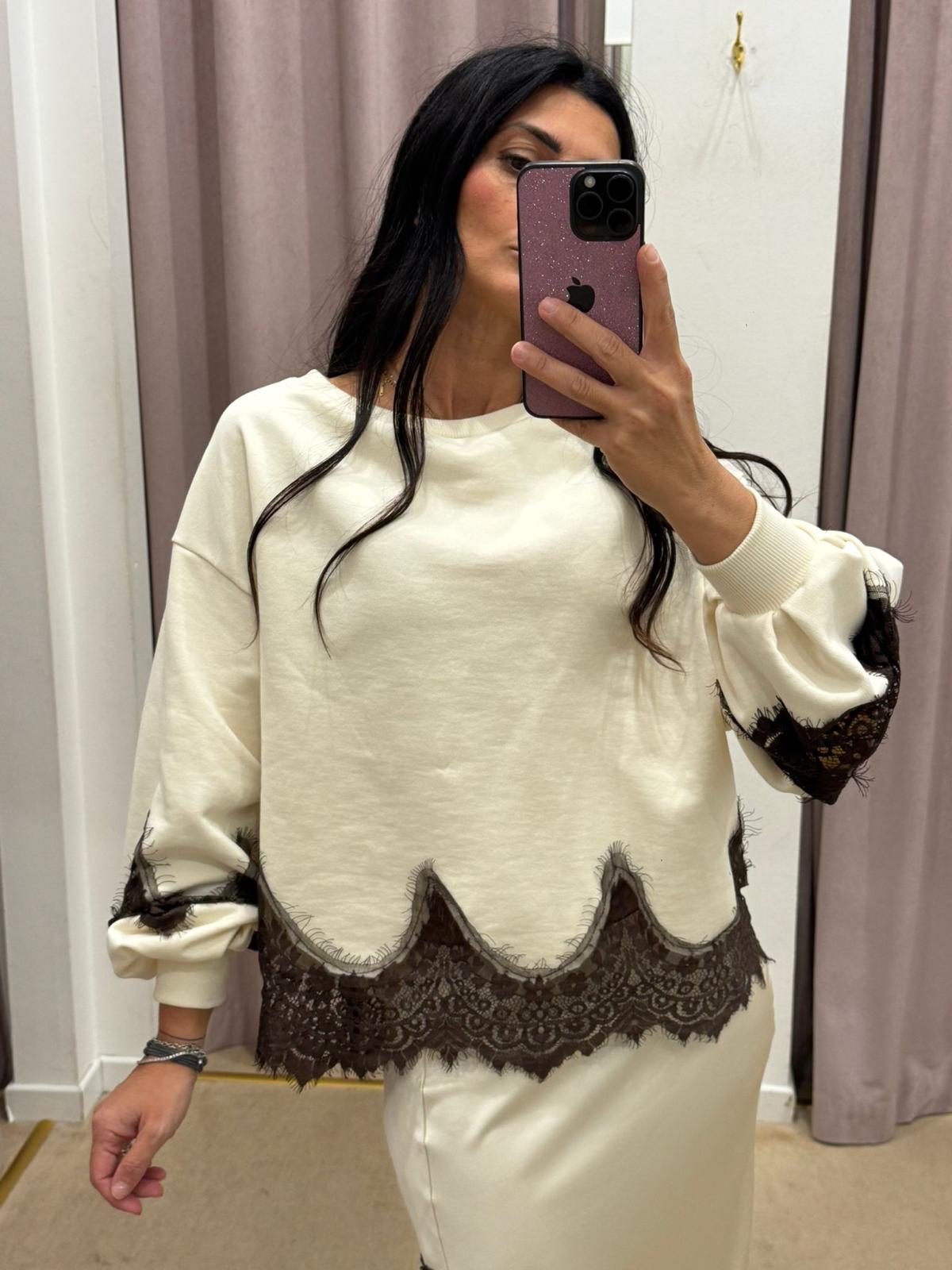 IVORY SWEATSHIRT WITH TENSION LACE INSERTS
