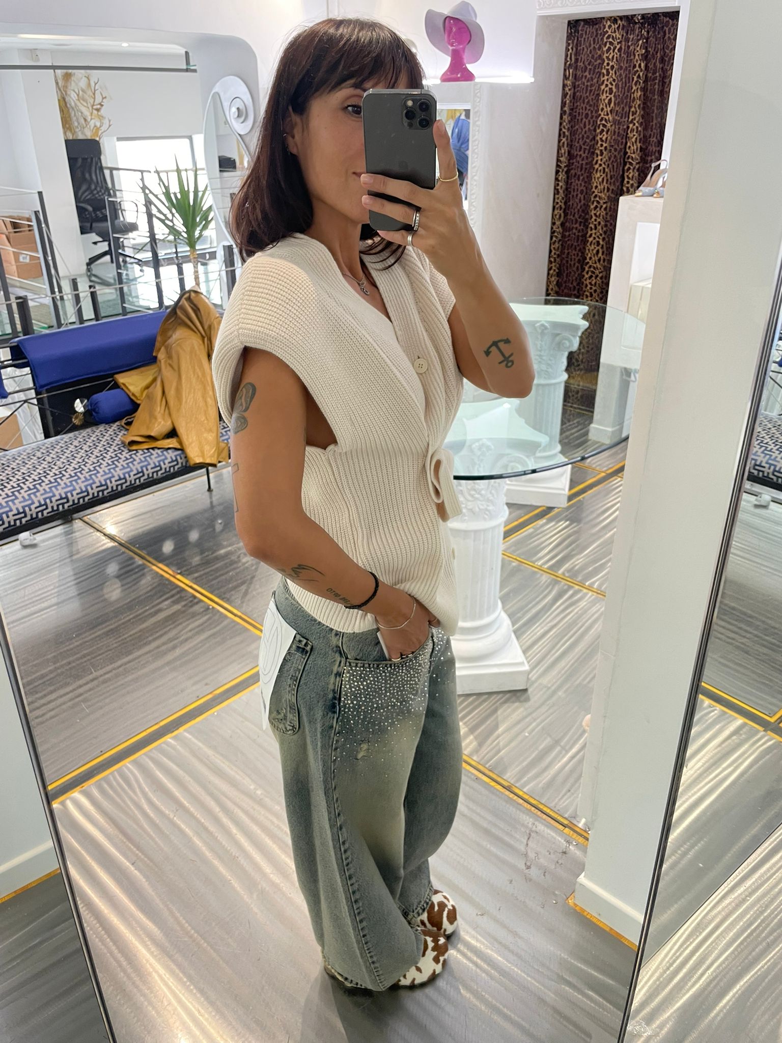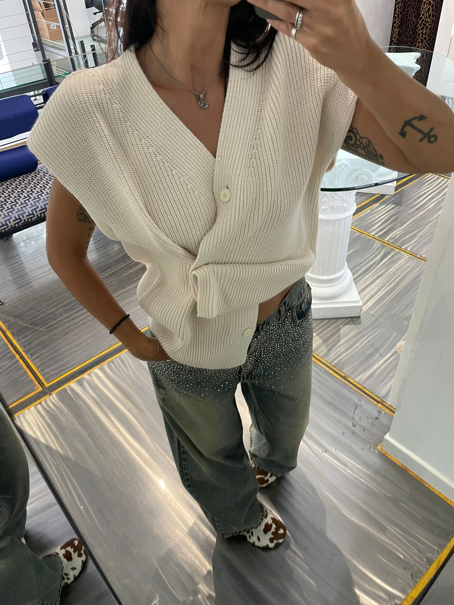 Corn-knit vest with a V-neck and front button closure. Padded shoulders.