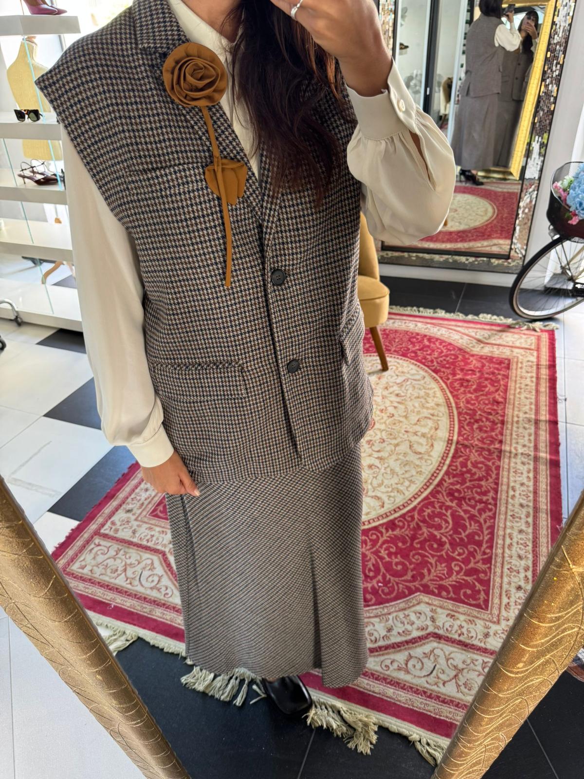 • Paired with a light shirt and a tan flower brooch, which adds an original touch.