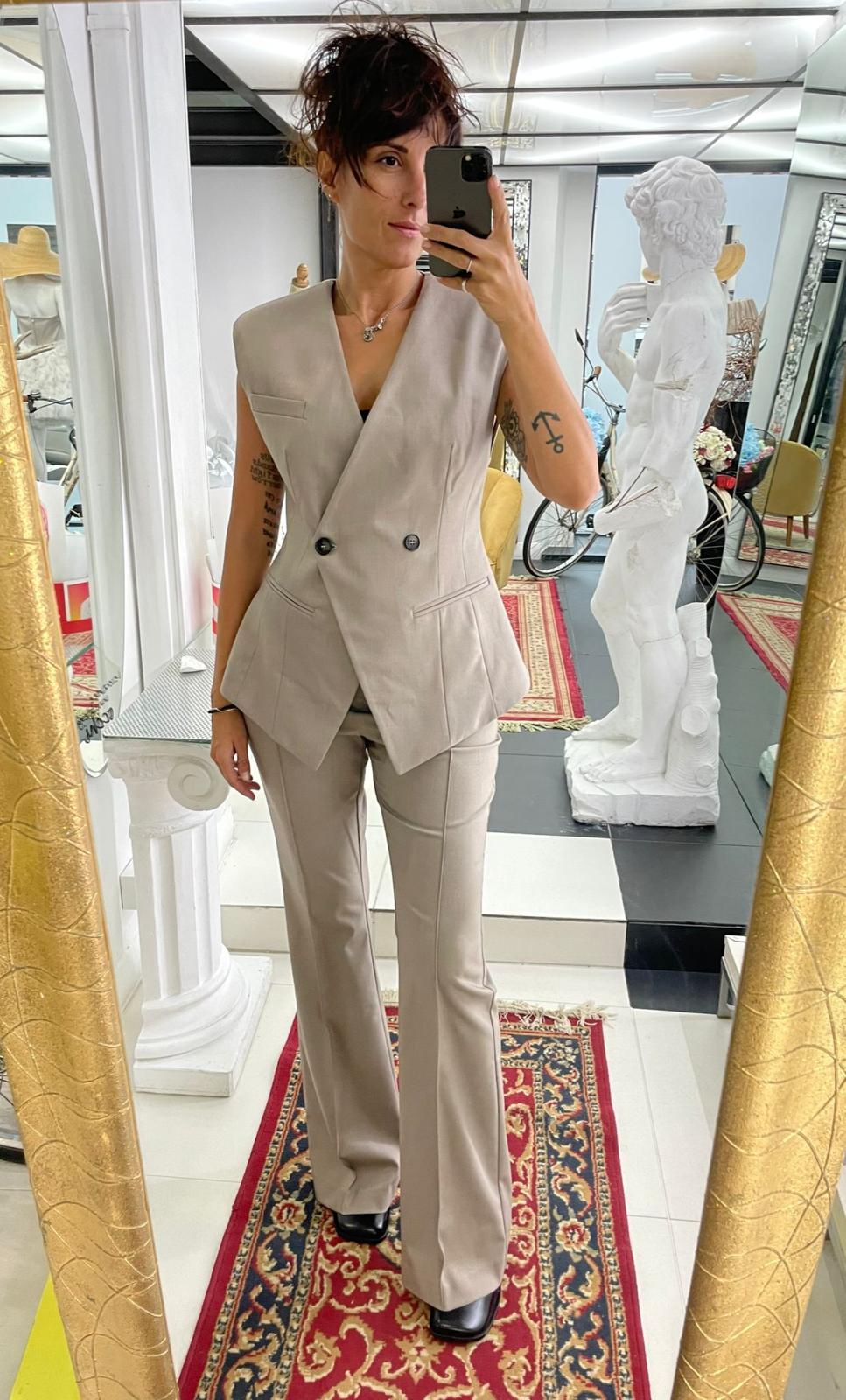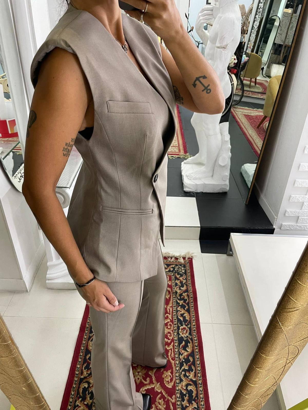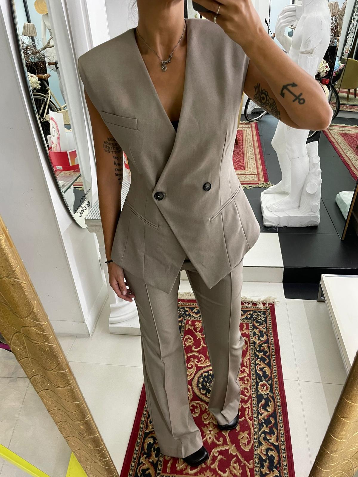 Long double-breasted tailored waistcoat in beige/dove grey fabric.
