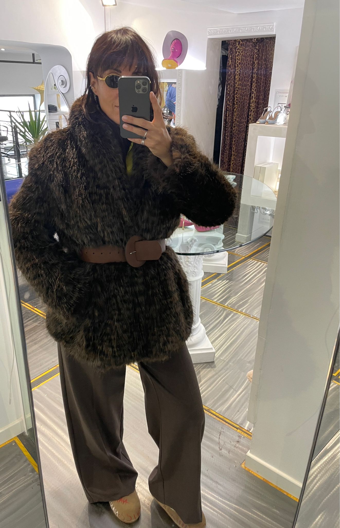 The outerwear is a short/mid-length faux fur in dark brown tones with lighter veins that create a spotted/melange effect.