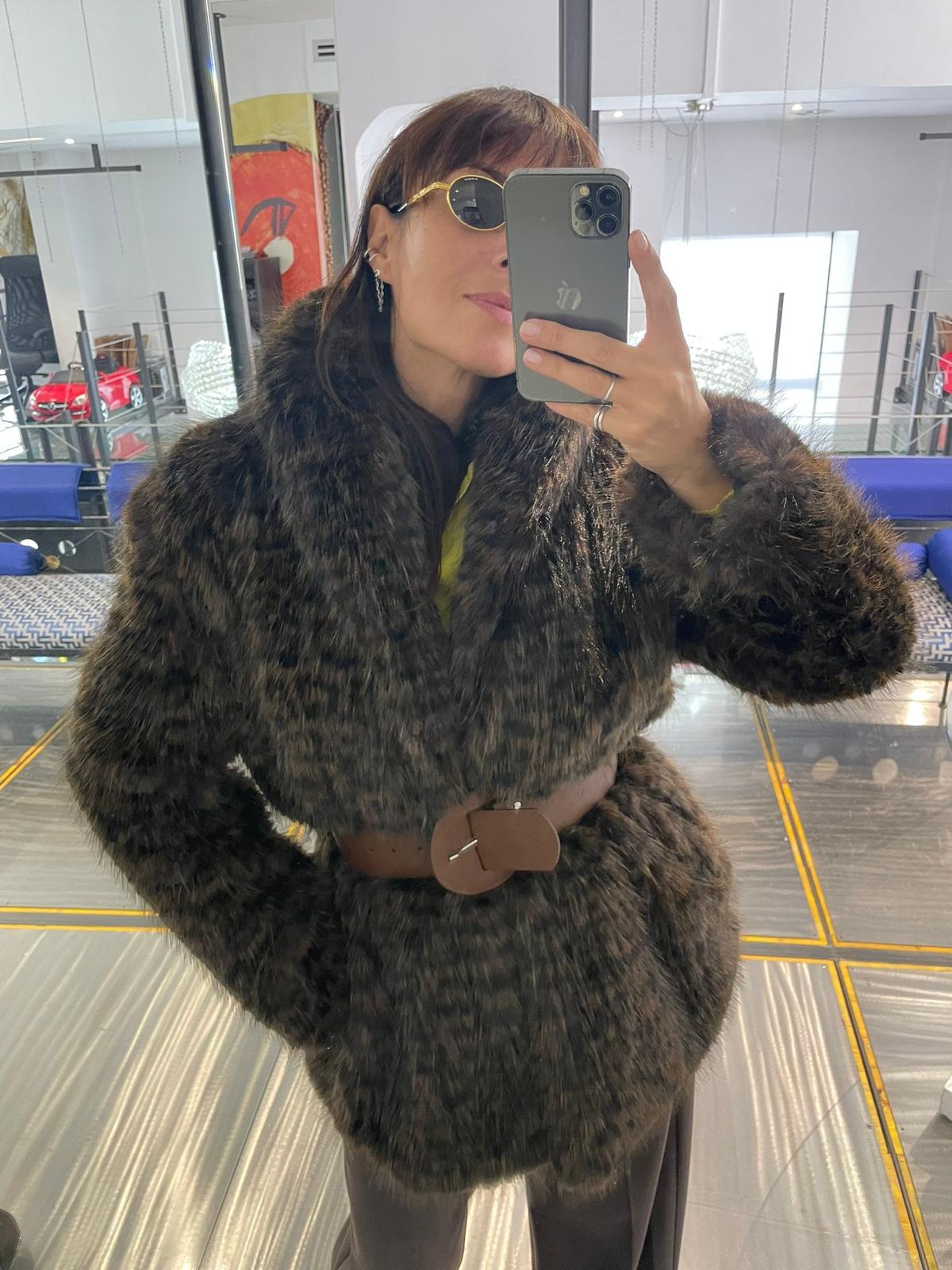• Closure: it is tightened at the waist with a wide brown leather belt with a round buckle, which emphasizes the silhouette and contrasts with the volume of the fur.