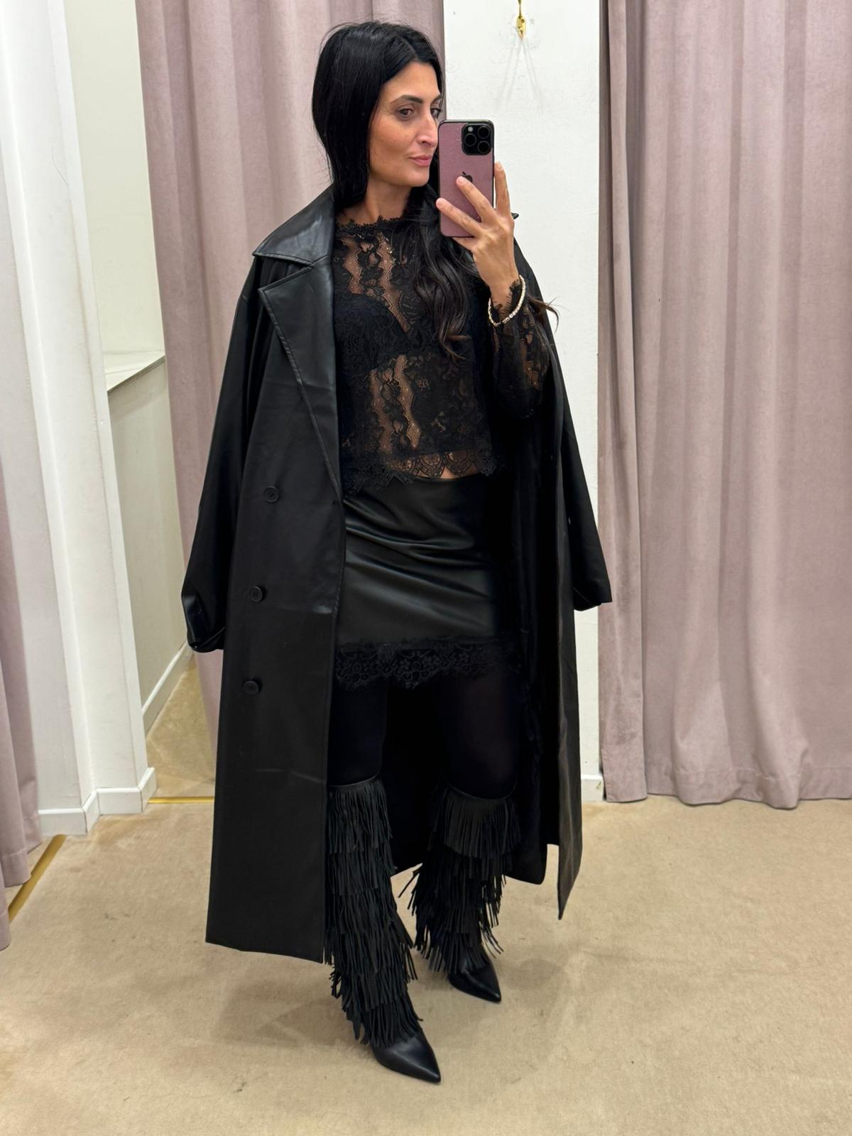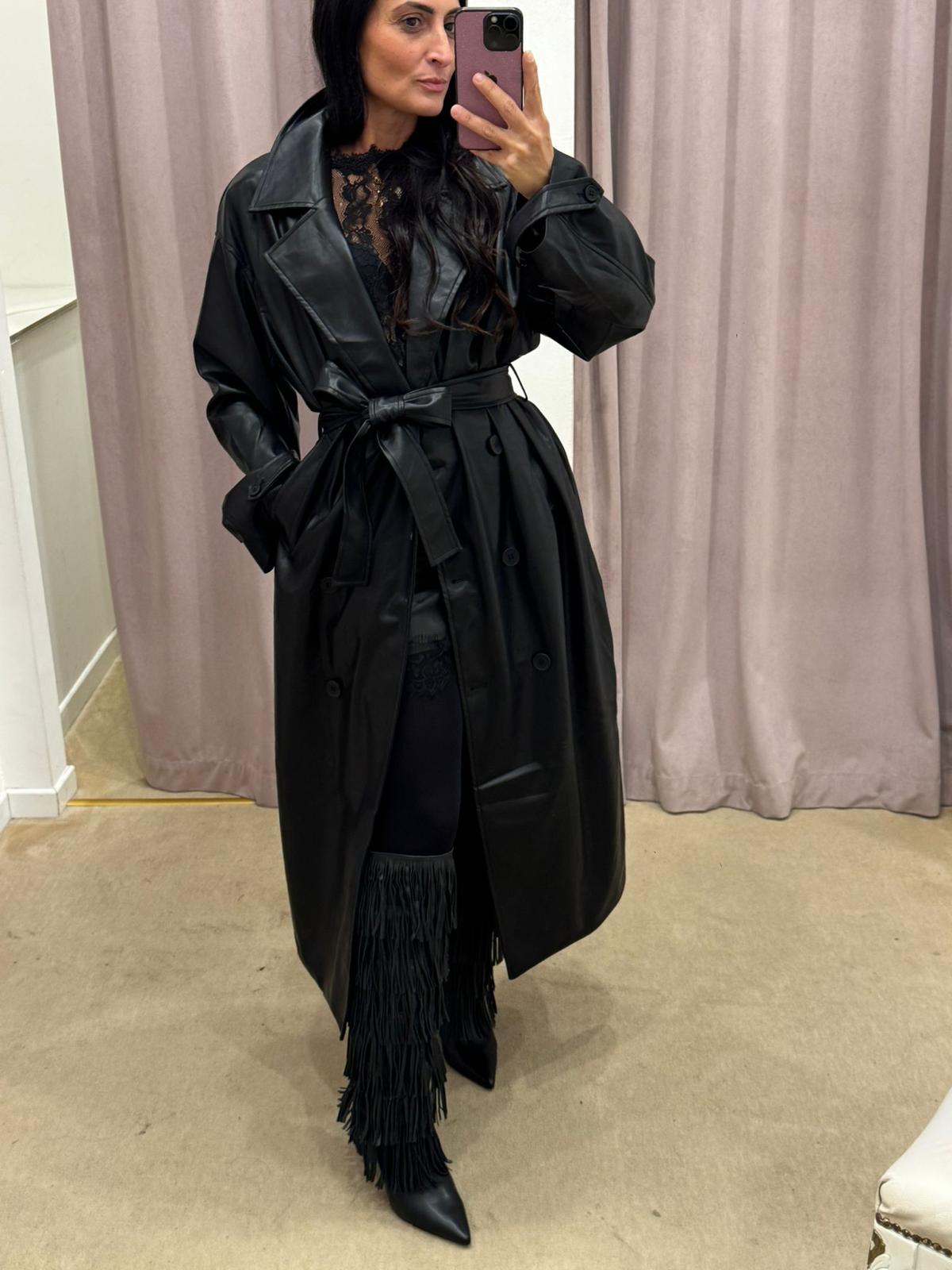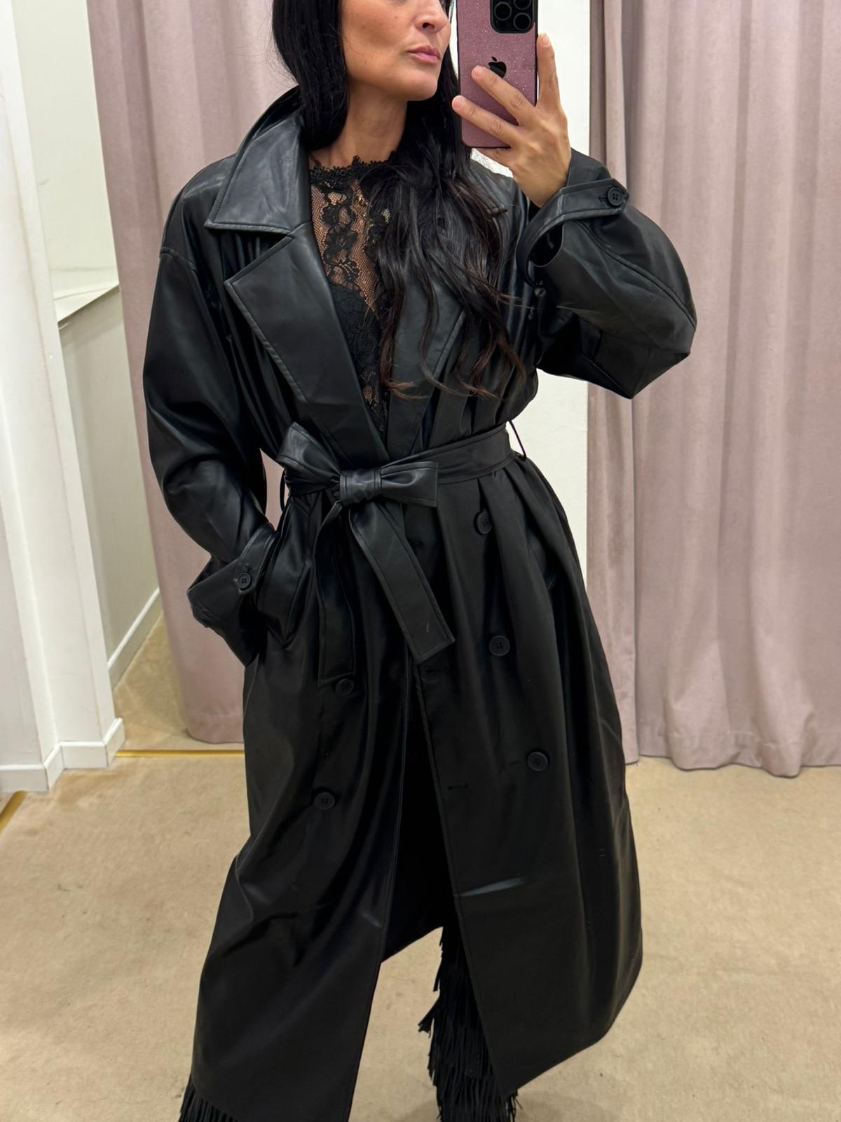 The double-breasted design with wide lapels and matching waist belt enhances the silhouette, while the fluid, slightly oversized cut ensures comfort and versatility.