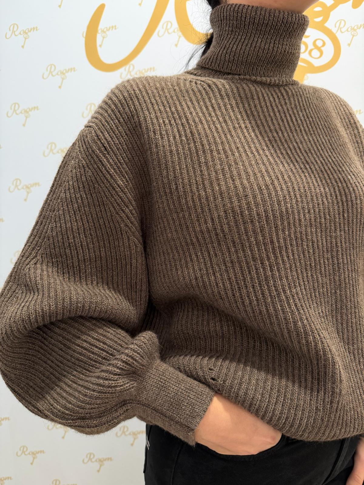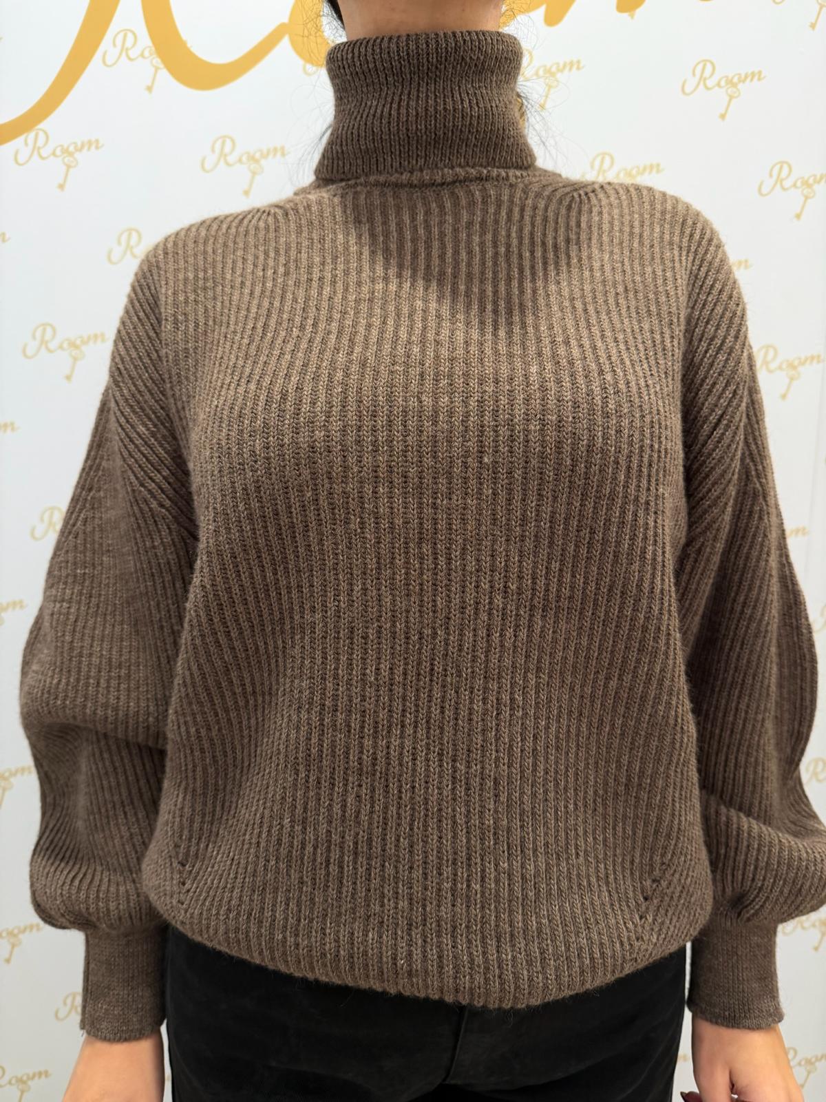 Maglia dolcevita, lavorazione a coste con manica ampia.