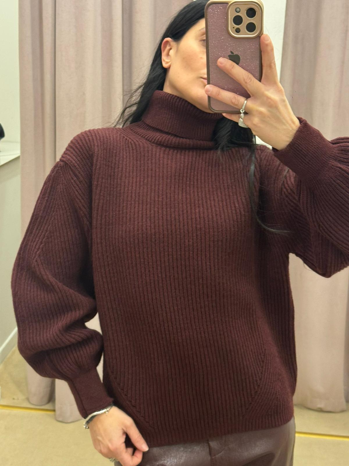 Maglia dolcevita, lavorazione a coste con manica ampia.