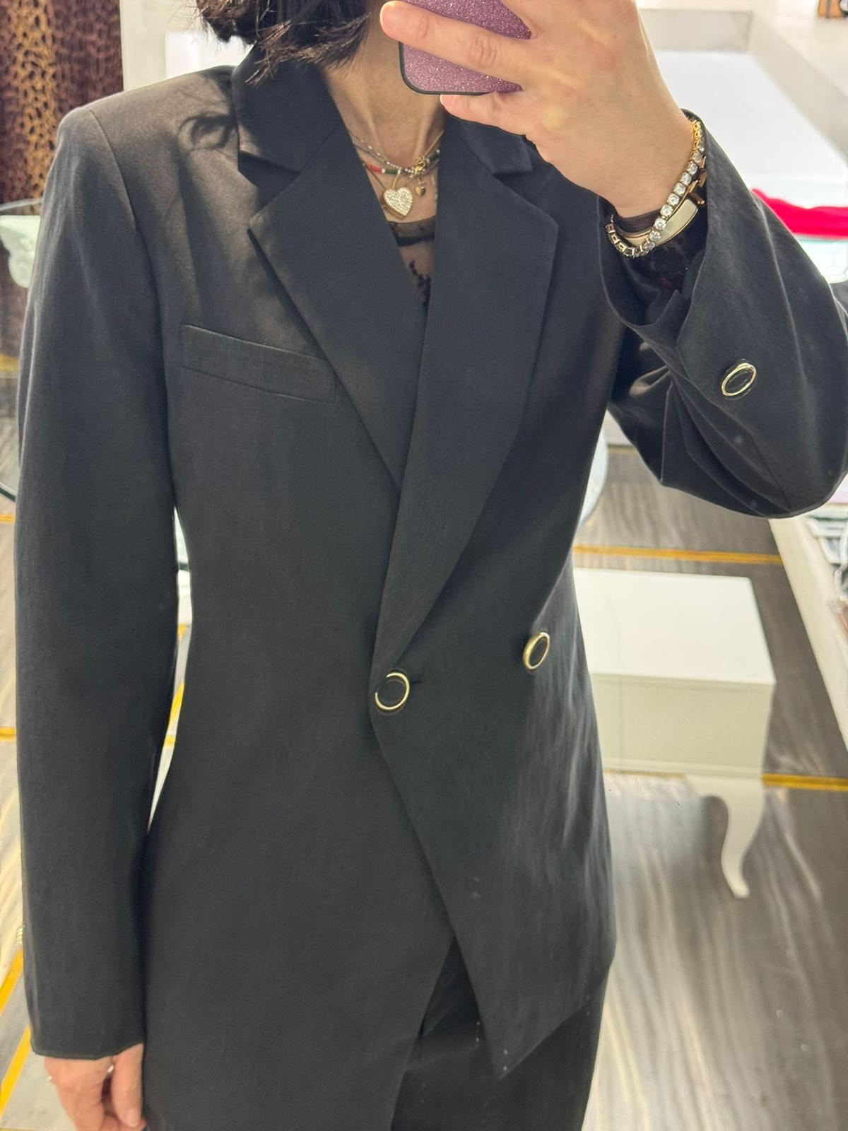 Blazer doppiopetto dalla linea regolare, caratterizzato da revers classici, taschino sul petto e chiusura con bottoni metallici. Ideale per comporre look sofisticati e versatili, si distingue per una silhouette che valorizza outfit contemporanei metropolitani e consente di giocare con diversi abbinamenti e stili personali.