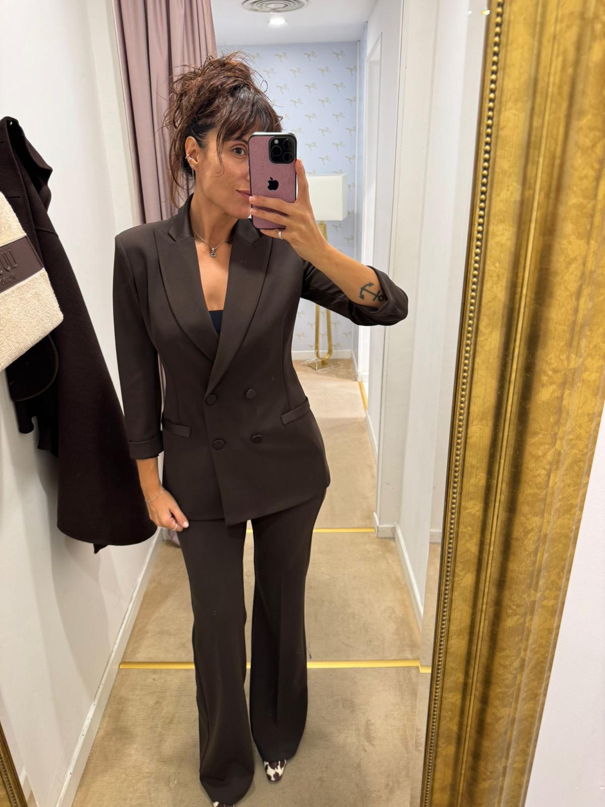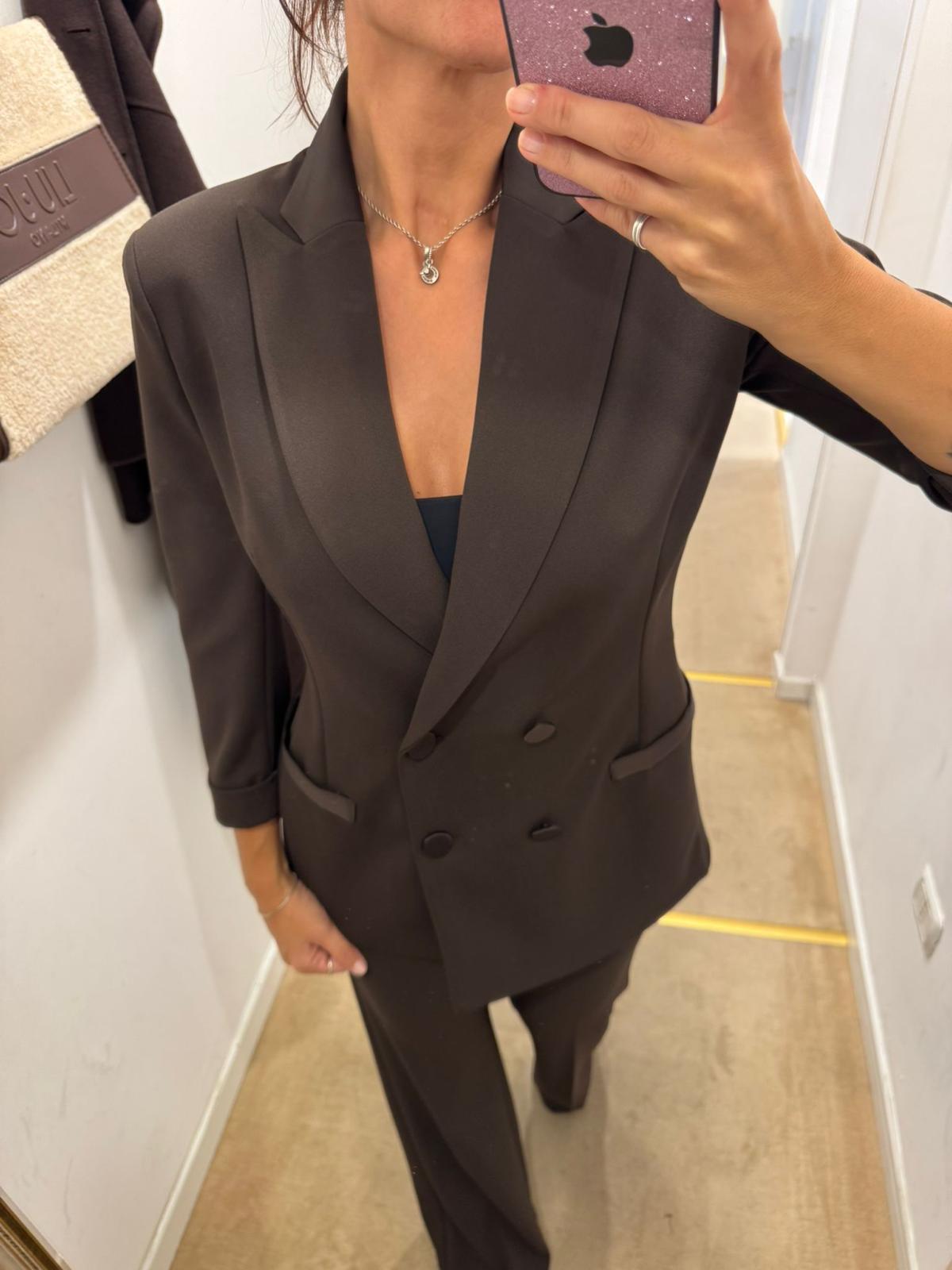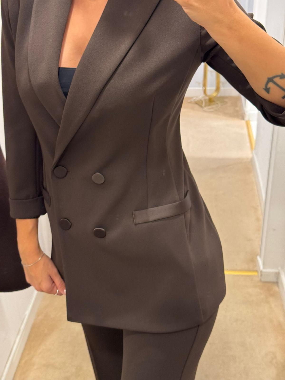 • Stile: doppiopetto, con quattro bottoni visibili (due per lato) e chiusura asimmetrica.